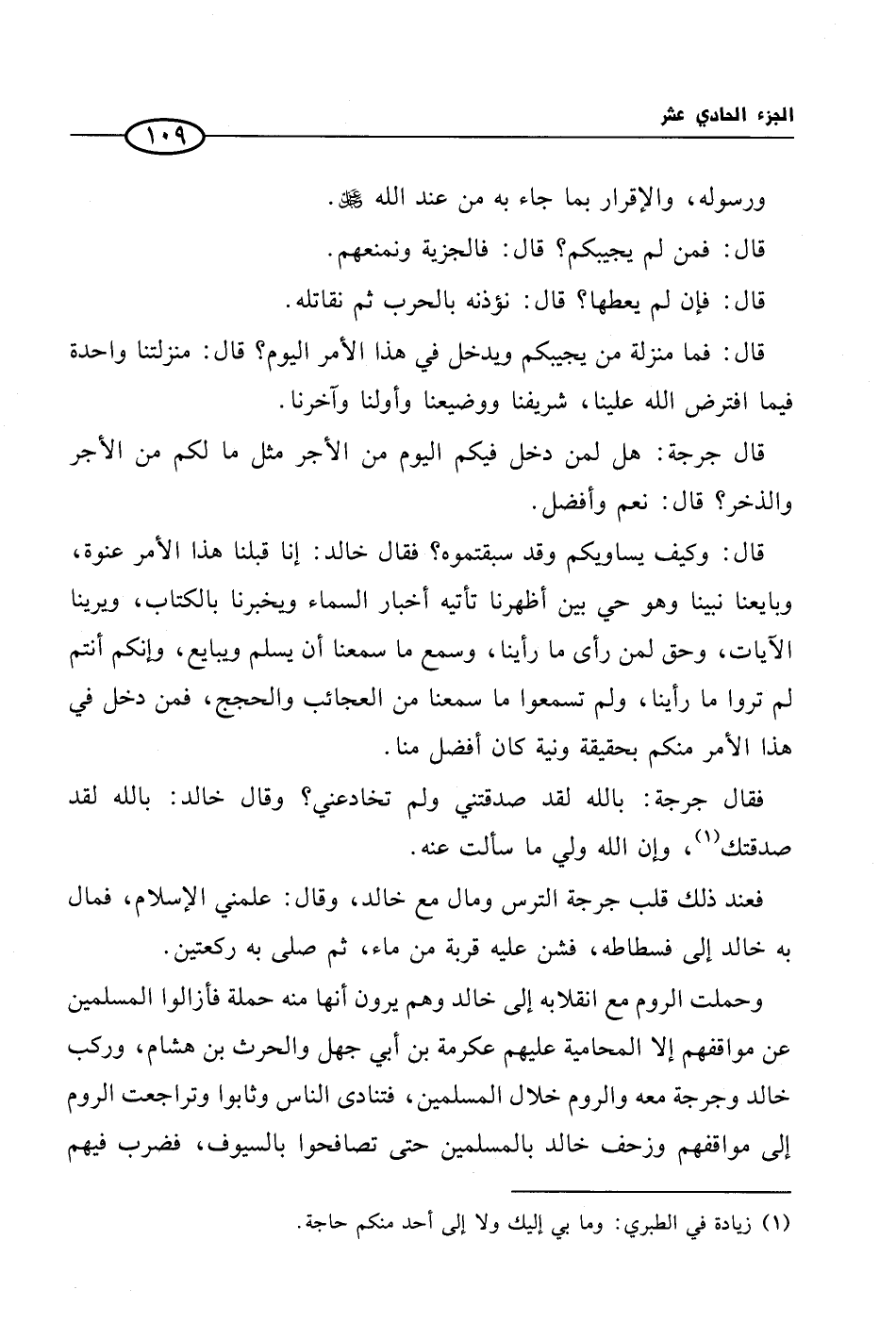فعند ذلك قلب جرجة الترس ومال مع خالد، وقال: علمني الإسلام، فمال به خالد إلى فسطاطه، فشن عليه قربة من ماء، ثم صلى به ركعتين.