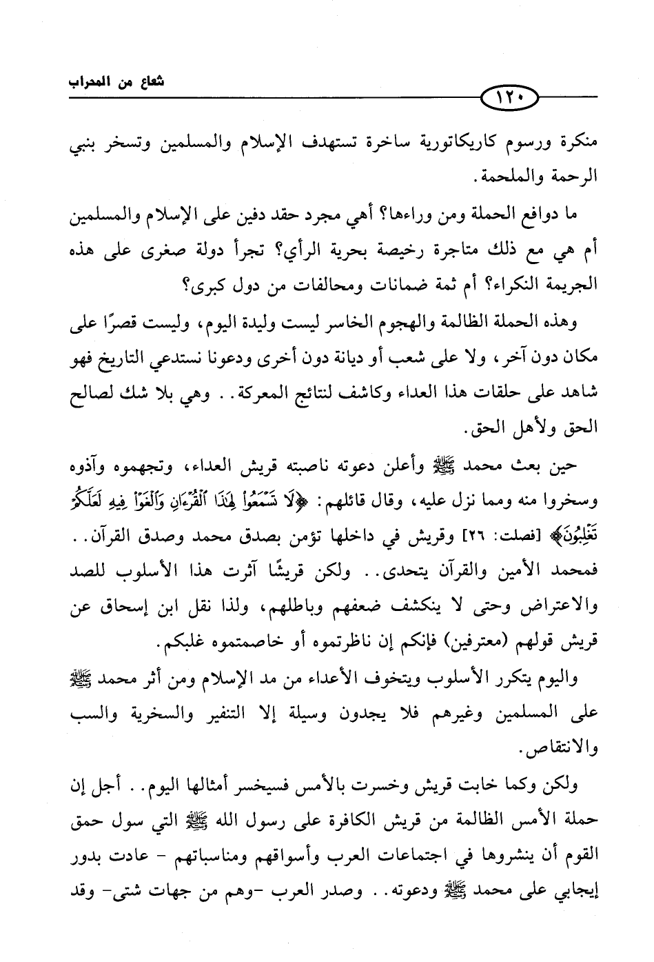 حين بعث محمد صلى الله عليه وسلم وأعلن دعوته ناصبته قريش العداء، وتجهموه وآذوه وسخروا منه ومما نزل عليه، وقال قائلهم: {لا تسمعوا لهذا القرآن والغوا فيه لعلكم تغلبون} [فصلت: 26] وقريش في داخلها تؤمن بصدق محمد وصدق القرآن .. فمحمد الأمين والقرآن يتحدى .. ولكن قريشًا آثرت هذا الأسلوب للصد والاعتراض وحتى لا ينكشف ضعفهم وباطلهم، ولذا نقل ابن إسحاق عن قريش قولهم (معترفين) فإنكم إن ناظرتموه أو خاصمتموه غلبكم.