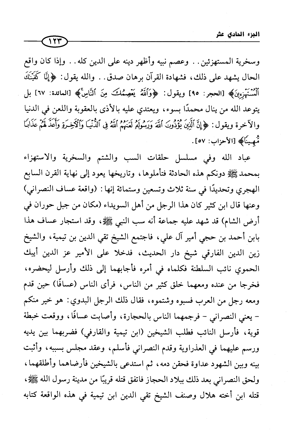 عباد الله وفي مسلسل حلقات السب والشتم والسخرية والاستهزاء بمحمد صلى الله عليه وسلم دونكم هذه الحادثة فتأملوها، وتاريخها يعود إلى نهاية القرن السابع الهجري وتحديدًا في سنة ثلاث وتسعين وستمائة وعنها قال الحافظ ابن كثير: (واقعة عساف النصراني) وعنها قال ابن كثير كان هذا الرجل من أهل السويداء (مكان من جبل حوران في أرض الشام) قد شهد عليه جماعة أنه سب النبي صلى الله عليه وسلم، وقد استجار عساف هذا بابن أحمد بن حجي أمير آل علي، فاجتمع الشيخ تقي الدين بن تيمية، والشيخ زين الدين الفارقي شيخ دار الحديث، فدخلا على الأمير عز الدين أيبك الحموي نائب السلطنة فكلماه في أمره فأجابهما إلى ذلك وأرسل ليحضره، فخرجا من عنده ومعهما خلق كثير من الناس، فرأى الناس (عسافًا) حين قدم ومعه رجل من العرب فسبوه وشتموه، فقال ذلك الرجل البدوي: هو خير منكم - يعني النصراني - فرجمهما الناس بالحجارة، وأصابت عسافًا، ووقعت خبطة قوية، فأرسل النائب فطلب الشيخين (ابن تيمية والقارفي) فضربهما بين يديه ورسم عليهما في العذراوية وقدم النصراني فأسلم، وعقد مجلس بسببه، وأثبت بينه وبين الشهود عداوة فحقن دمه، ثم استدعى بالشيخين فأرضاهما وأطلقهما، ولحق النصراني بعد ذلك ببلاد الحجاز فاتفق قتله قريبًا من مدينة رسول الله صلى الله عليه وسلم، قتله ابن أخته هلال وصنف الشيخ تقي الدين ابن تيمية في هذه الواقعة كتابه