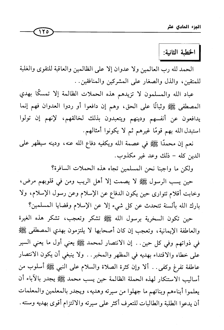 حين تكون السخرية برسول الله صلى الله عليه وسلم تشكر وتعجب، وتشكر هذه الغيرة والعاطفة الإيمانية، وتعجب إن كان أصحابها لا يلتزمون بهدي المصطفى صلى الله عليه وسلم في ذواتهم وفي كل حين .. إن الانتصار لمحمد صلى الله عليه وسلم يعني أول ما يعني السير على خطاه والاقتداء بهديه في المظهر والمخبر .. ولا ينبغي أن يكون الانتصار عاطفة تفرغ وكفى .. ألا وإن كثرة الصلاة والسلام على النبي صلى الله عليه وسلم أسلوب من أساليب الاستنكار لهذه الحملة الظالمة حين يسب محمد صلى الله عليه وسلم يجدر بالآباء أن يعلموا أبناءهم وبناتهم ما جهلوا من سيرته وهديه، ويجدر بالمعلمين والمعلمات أن يدعوا الطلبة والطالبات للتعرف أكثر على سيرته والالتزام أقوى بهديه وسنته.