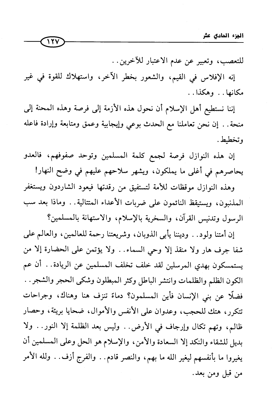 إن أمتنا ولود .. وديننا يأبى الذوبان، وشريعتنا رحمة للعالمين، والعالم على شفا جرف هار ولا منقذ إلا وحي السماء .. ولا يؤتمن على الحضارة إلا من يستمسكون بهدي المرسلين لقد خلف تخلف المسلمين عن الريادة .. أن عم الكون الظلم والظلمات وانتشر الباطل وكثر المبطلون وشكى الحجر والشجر .. فضلاً عن بني الإنسان فأين المسلمون؟ دماءً تنزف هنا وهناك، وجراحات تتكرر، هتك للحجب، وعدوان على الأنفس والأموال، ضحايا بريئة، وحصار ظالم، وتهم تكال وإرجاف في الأرض .. وليس بعد الظلمة إلا النور .. ولا بديل للشقاء والنكد إلا السعادة والأمن، والإسلام هو الحل وعلى المسلمين أن يغيروا ما بأنفسهم ليغير الله ما بهم، والنصر قادم .. والفرج آذف .. ولله الأمر من قبل ومن بعد.