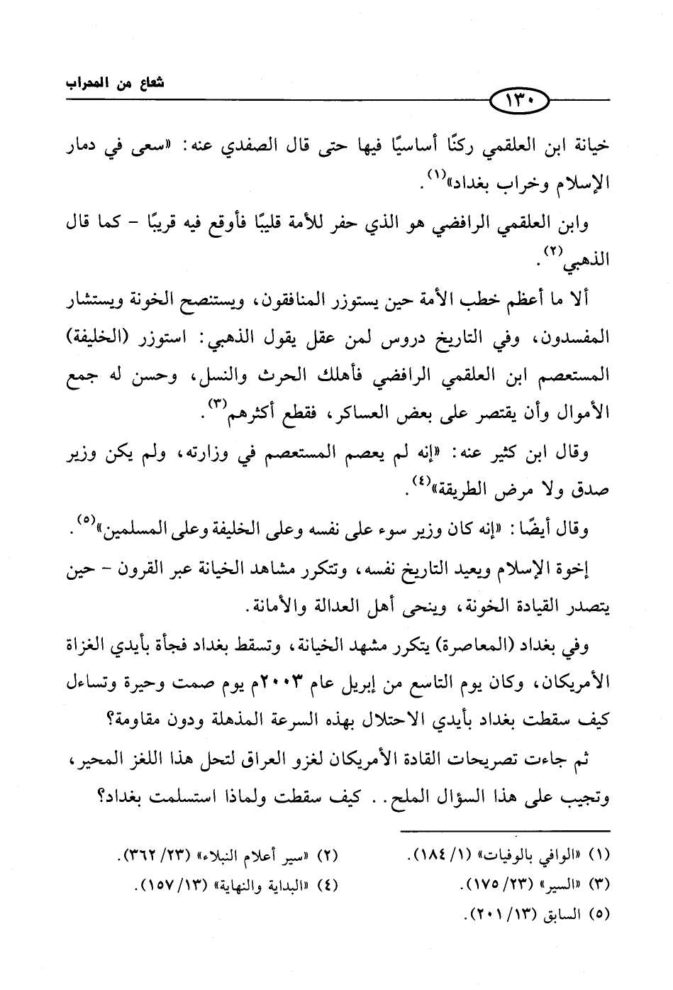 ألا ما أعظم خطب الأمة حين يستوزر المنافقون، ويستنصح الخونة ويستشار المفسدون، وفي التاريخ دروس لمن عقل يقول الذهبي: استوزر (الخليفة) المستعصم ابن العلقمي الرافضي فأهلك الحرث والنسل، وحسن له جمع الأموال وأن يقتصر على بعض العساكر، فقطع أكثرهم (¬3).