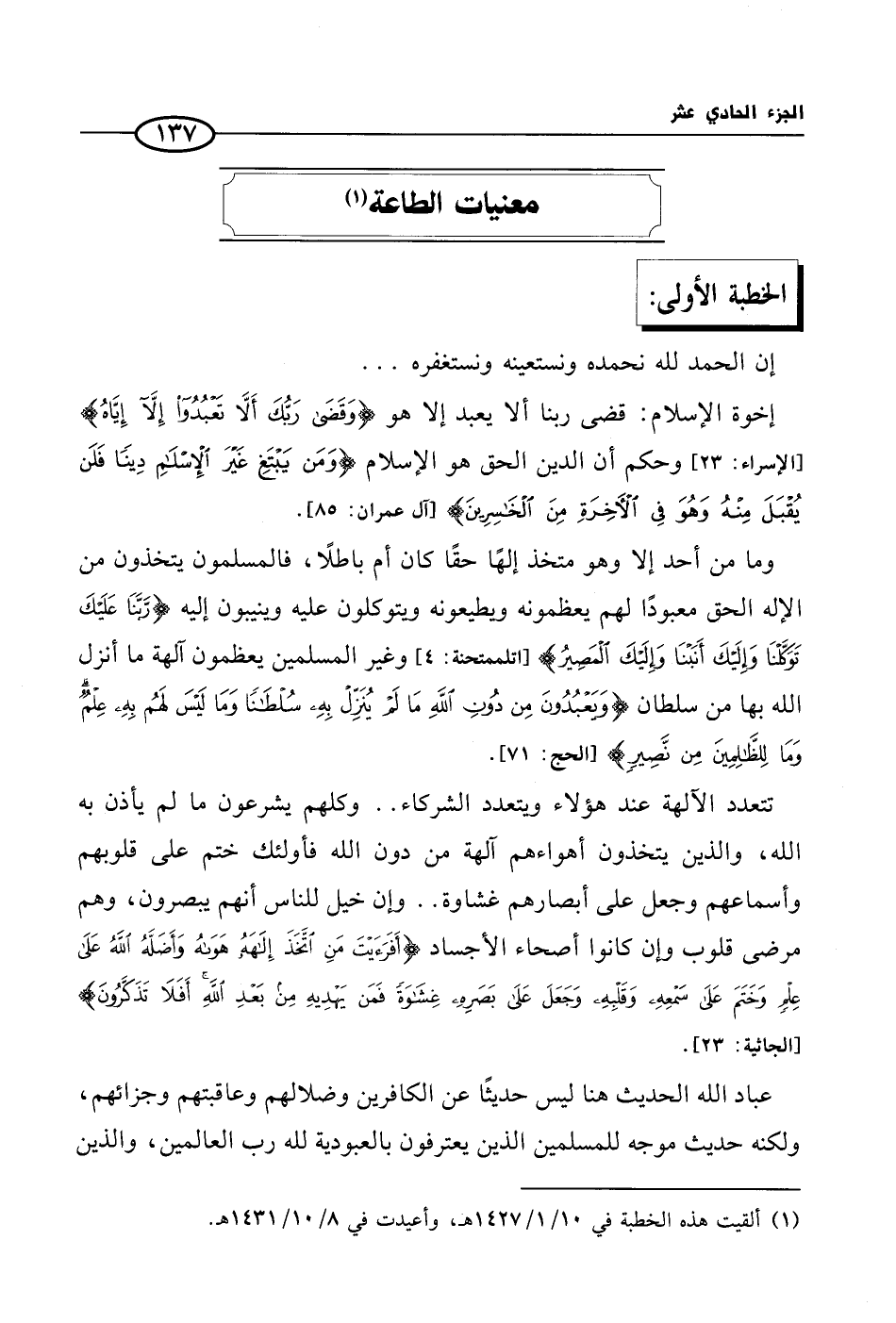 (¬1) ألقيت هذه الخطبة في 10/ 1/ 1427 هـ، وأعيدت في 8/ 10/ 1431 هـ