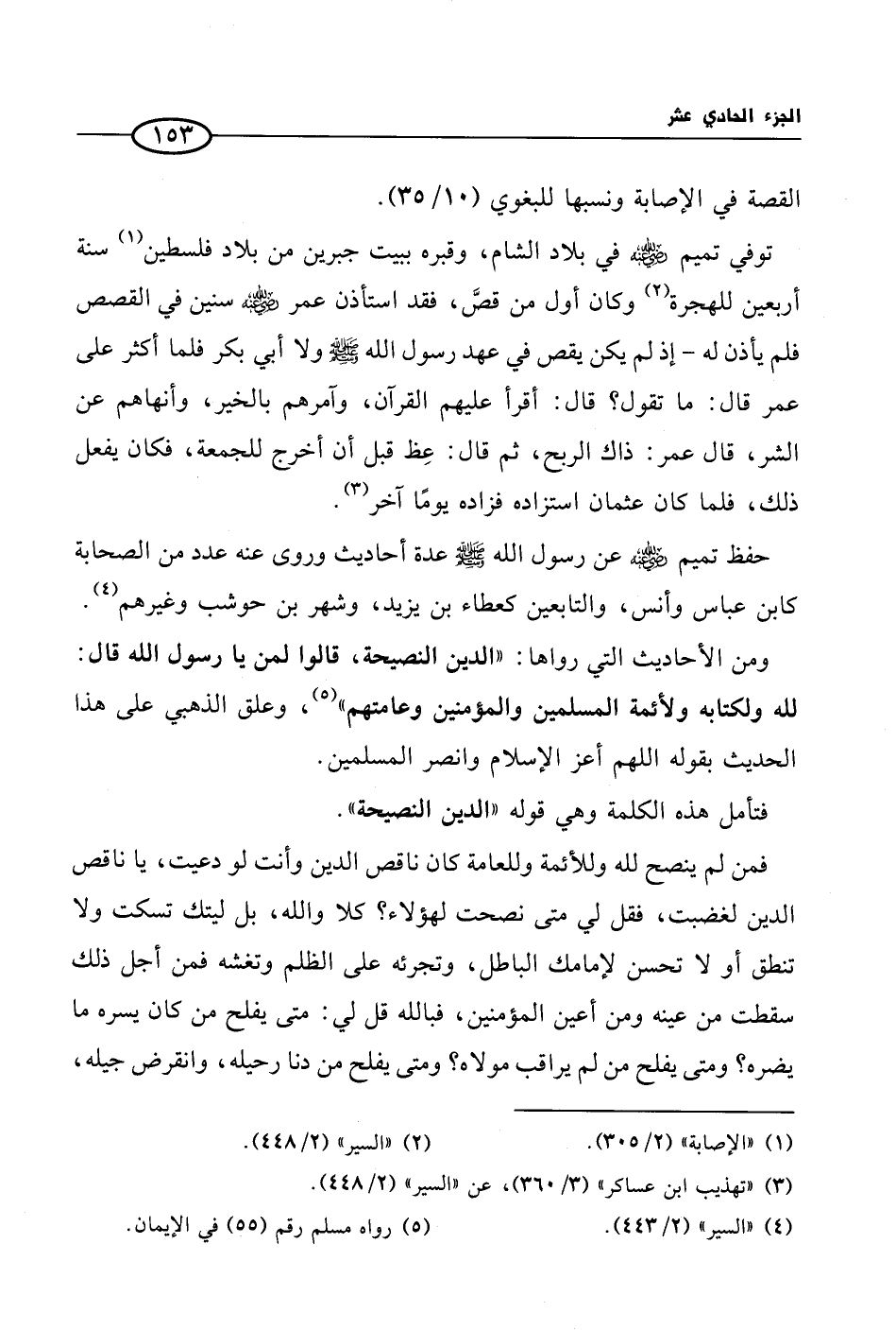 ومن الأحاديث التي رواها: «الدين النصيحة، قالوا لمن يا رسول الله قال: لله ولكتابه ولأئمة المسلمين والمؤمنين وعامتهم» (¬5)، وعلق الذهبي على هذا الحديث بقوله اللهم أعز الإسلام وانصر المسلمين.