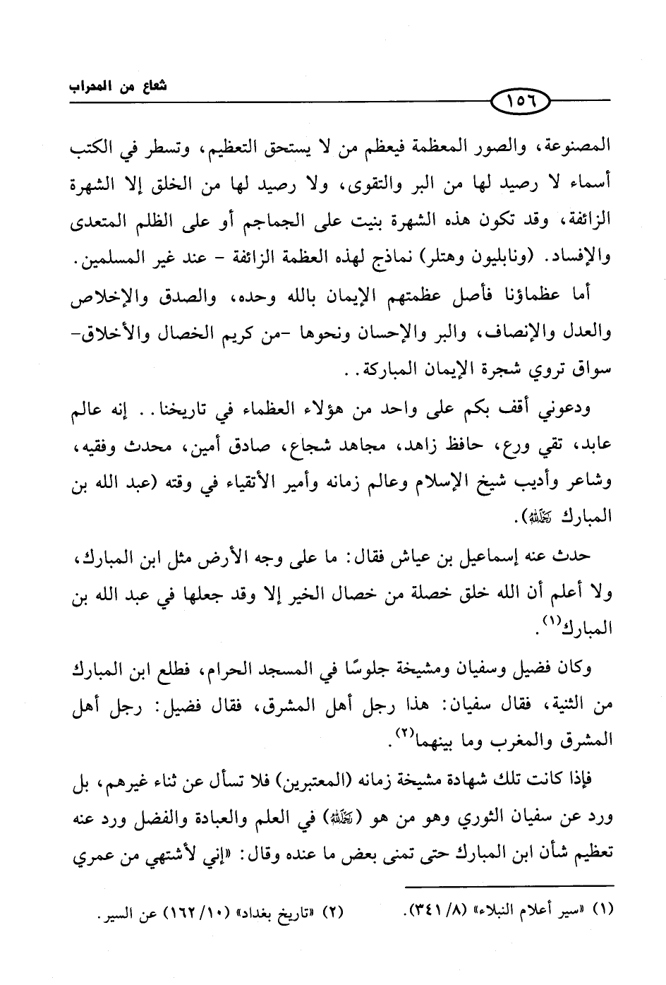 ودعوني أقف بكم على واحد من هؤلاء العظماء في تاريخنا .. إنه عالم عابد، تقي ورع، حافظ زاهد، مجاهد شجاع، صادق أمين، محدث وفقيه، وشاعر وأديب شيخ الإسلام وعالم زمانه وأمير الأتقياء في وقته (عبد الله بن المبارك رحمه الله).