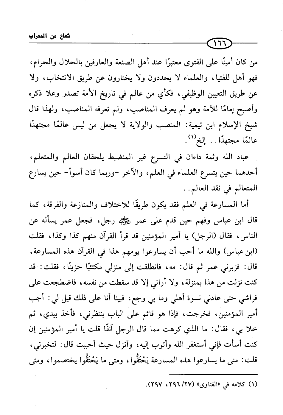 أما المسارعة في العلم فقد يكون طريقًا للاختلاف والمنازعة والفرقة، كما قال ابن عباس وفهم حين قدم على عمر رضي الله عنه رجل، فجعل عمر يسأله عن الناس، فقال (الرجل) يا أمير المؤمنين قد قرأ القرآن منهم كذا وكذا، فقلت (ابن عباس) والله ما أحب أن يسارعوا يومهم هذا في القرآن هذه المسارعة، قال: فزبرني عمر ثم قال: مه، فانطلقت إلى منزلي مكتئبًا حزينًا، فقلت: قد كنت نزلت من هذا بمنزلة، ولا أراني إلا قد سقطت من نفسه، فاضطجعت على فراشي حتى عادني نسوة أهلي وما بي وجع، فبينا أنا على ذلك قيل لي: أجب أمير المؤمنين، فخرجت، فإذا هو قائم على الباب ينتظرني، فأخذ بيدي، ثم خلا بي، فقال: ما الذي كرهت مما قال الرجل آنفًا قلت يا أمير المؤمنين إن كنت أسأت فإني أستغفر الله وأتوب إليه، وأنزل حيث أحببت قال: لتخبرني، قلت: متى ما يسارعوا هذه المسارعة يَحْتَقُّوا، ومتى ما يَحْتَقُّوا يختصموا، ومتى
