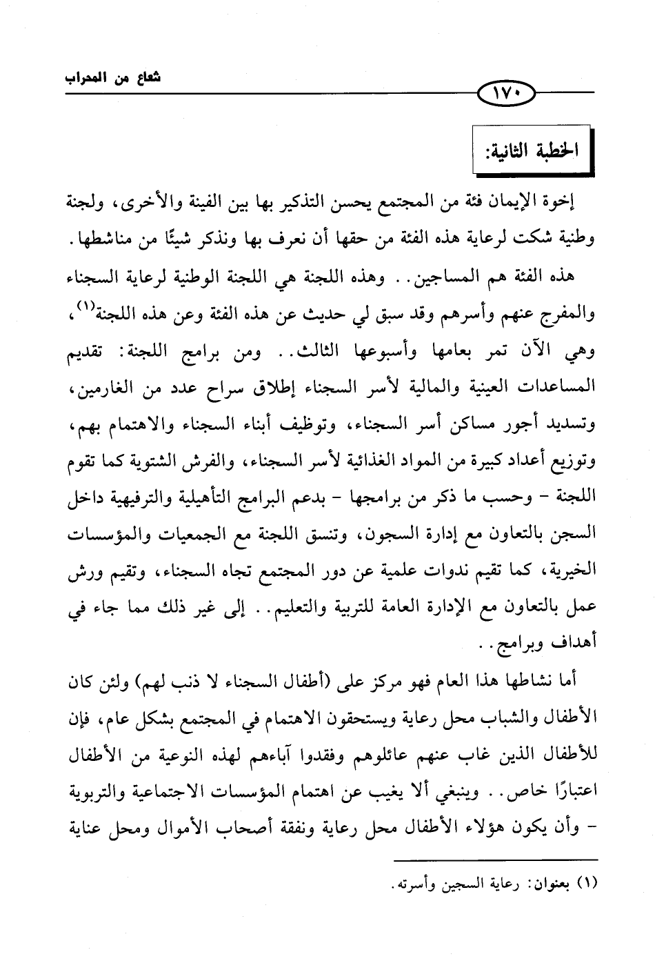 هذه الفئة هم المساجين .. وهذه اللجنة هي اللجنة الوطنية لرعاية السجناء والمفرج عنهم وأسرهم وقد سبق لي حديث عن هذه الفئة وعن هذه اللجنة (¬1)، وهي الآن تمر بعامها وأسبوعها الثالث .. ومن برامج اللجنة: تقديم المساعدات العينية والمالية لأسر السجناء إطلاق سراح عدد من الغارمين، وتسديد أجور مساكن أسر السجناء، وتوظيف أبناء السجناء والاهتمام بهم، وتوزيع أعداد كبيرة من المواد الغذائية لأسر السجناء، والفرش الشتوية كما تقوم اللجنة - وحسب ما ذكر من برامجها - بدعم البرامج التأهيلية والترفيهية داخل السجن بالتعاون مع إدارة السجون، وتنسق اللجنة مع الجمعيات والمؤسسات الخيرية، كما تقيم ندوات علمية عن دور المجتمع تجاه السجناء، وتقيم ورش عمل بالتعاون مع الإدارة العامة للتربية والتعليم .. إلى غير ذلك مما جاء في أهداف وبرامج ..