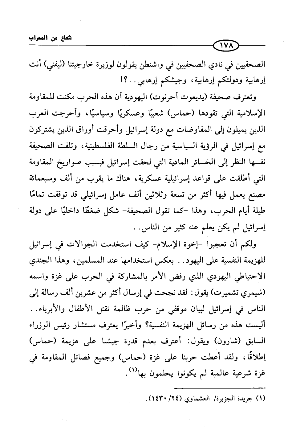 وتعترف صحيفة (يديعوت أحرنوت) اليهودية أن هذه الحرب مكنت للمقاومة الإسلامية التي تقودها (حماس) شعبيًا وعسكريًا وسياسيًا، وأحرجت العرب الذين يميلون إلى المفاوضات مع دولة إسرائيل وأحرقت أوراق الذين يشتركون مع إسرائيل في الرؤية السياسية من رجال السلطة الفلسطينية وتلفت الصحيفة نفسها النظر إلى الخسائر المادية التي لحقت إسرائيل فبسبب صواريخ المقاومة التي أطلقت على قواعد إسرائيلية عسكرية، هناك ما يقرب من ألف وسبعمائة مصنع يعمل فيها أكثر من تسعة وثلاثين ألف عامل إسرائيلي قد توقفت تمامًا طيلة أيام الحرب، وهذا - كما تقول الصحيفة - شكل ضغطًا داخليًا على دولة إسرائيل لم يكن يعلم عنه كثير من الناس ..