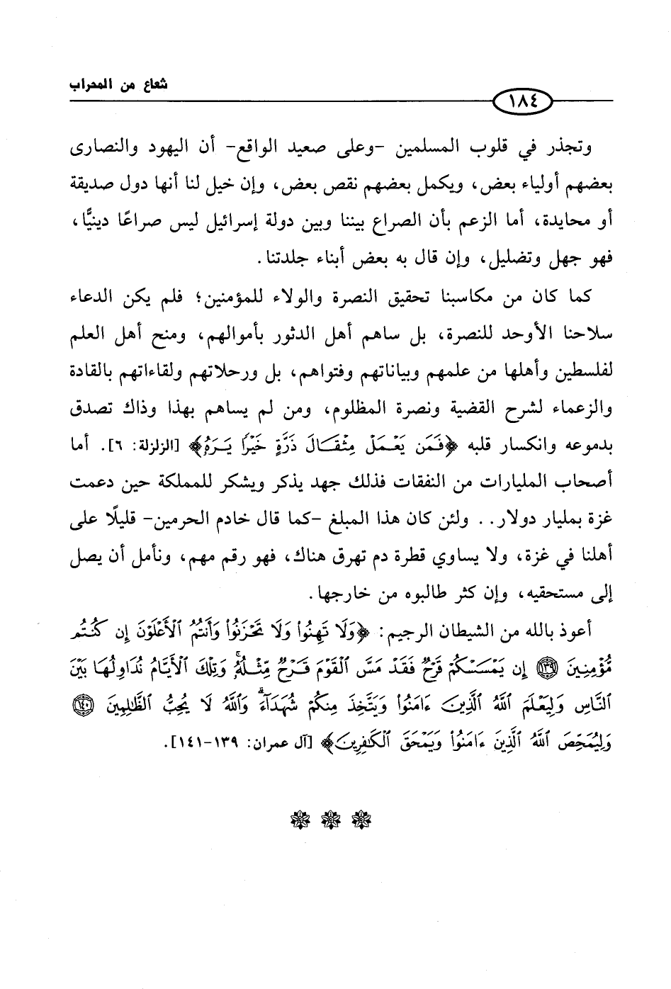 كما كان من مكاسبنا تحقيق النصرة والولاء للمؤمنين؛ فلم يكن الدعاء سلاحنا الأوحد للنصرة، بل تساهم أهل الدثور بأموالهم، ومنح أهل العلم لفلسطين وأهلها من علمهم وبياناتهم وفتواهم، بل ورحلاتهم ولقاءاتهم بالقادة والزعماء لشرح القضية ونصرة المظلوم، ومن لم يساهم بهذا وذاك تصدق بدموعه وانكسار قلبه {فَمَنْ يَعْمَلْ مِثْقَالَ ذَرَّةٍ خَيْرًا يَرَهُ} [الزلزلة: 6]. أما أصحاب المليارات من النفقات فذلك جهد يذكر ويشكر للمملكة حين دعمت غزة بمليار دولار .. ولئن كان هذا المبلغ -كما قال خادم الحرمين- قليلًا على أهلنا في غزة، ولا يساوي قطرة دم تهرق هناك، فهو رقم مهم، ونأمل أن يصل إلى مستحقيه، وإن كثر طالبوه من خارجها.