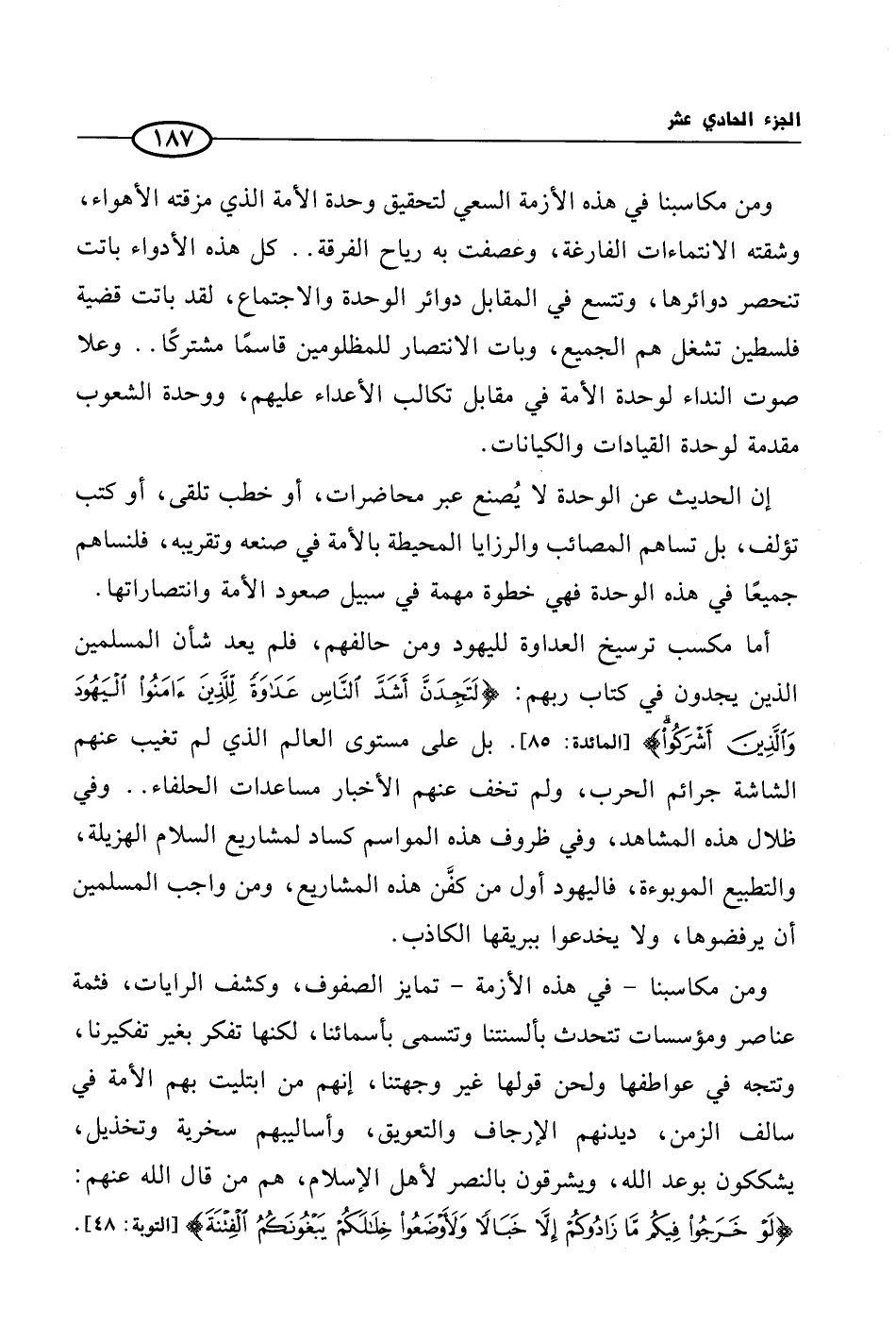 ومن مكاسبنا في هذه الأزمة السعي لتحقيق وحدة الأمة الذي مزقته الأهواء، وشقته الانتماءات الفارغة، وعصفت به رياح الفرقة .. كل هذه الأدواء باتت تنحصر دوائرها، وتتسع في المقابل دوائر الوحدة والاجتماع، لقد باتت قضية فلسطين تشغل هم الجميع، وبات الانتصار للمظلومين قاسمًا مشتركًا .. وعلا صوت النداء لوحدة الأمة في مقابل تكالب الأعداء عليهم، ووحدة الشعوب مقدمة لوحدة القيادات والكيانات.