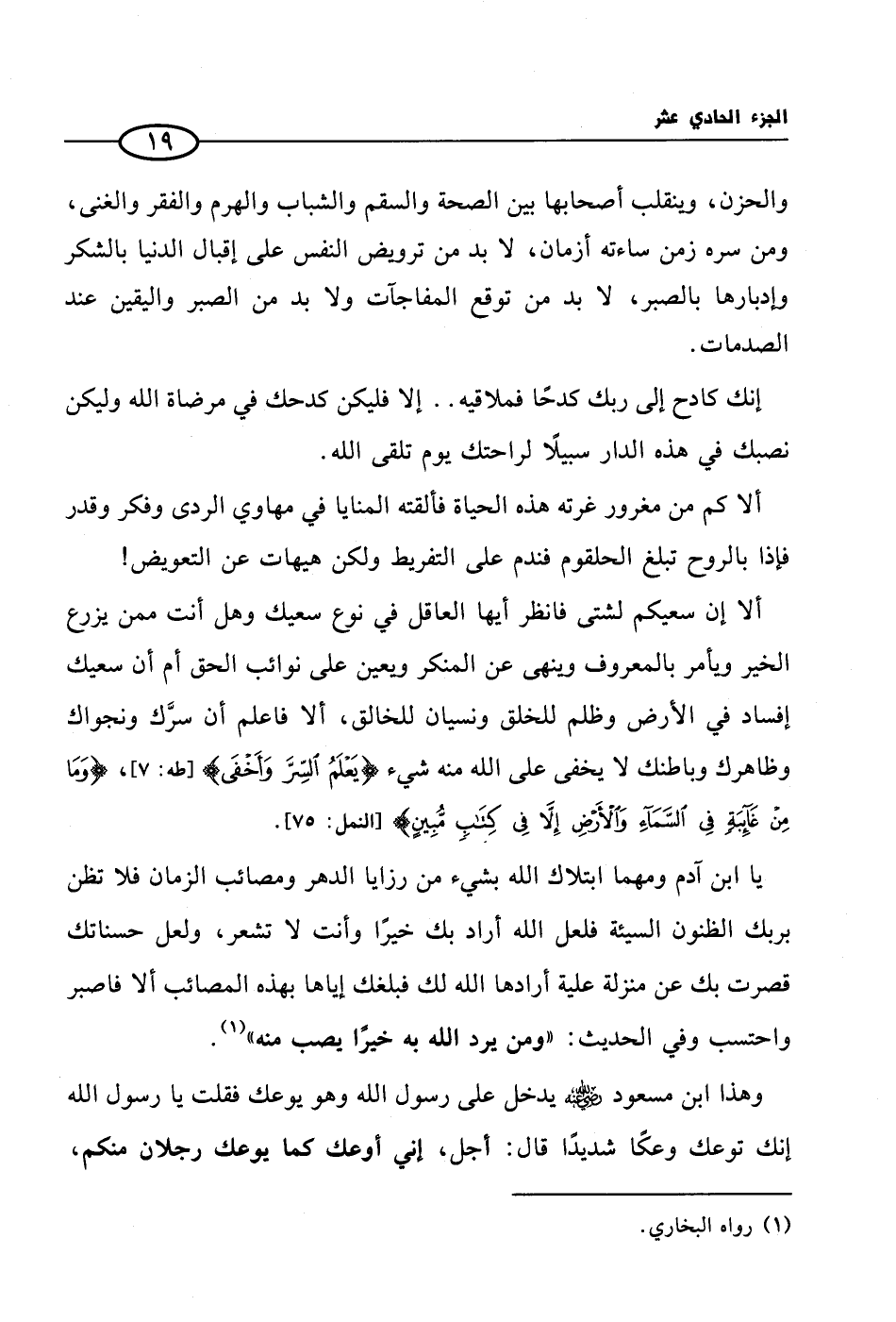 والحزن، وينقلب أصحابها بين الصحة والسقم والشباب والهرم والفقر والغنى، ومن سره زمن ساءته أزمان، لا بد من ترويض النفس على إقبال الدنيا بالشكر وإدبارها بالصبر، لا بد من توقع المفاجآت ولا بد من الصبر واليقين عند الصدمات.
