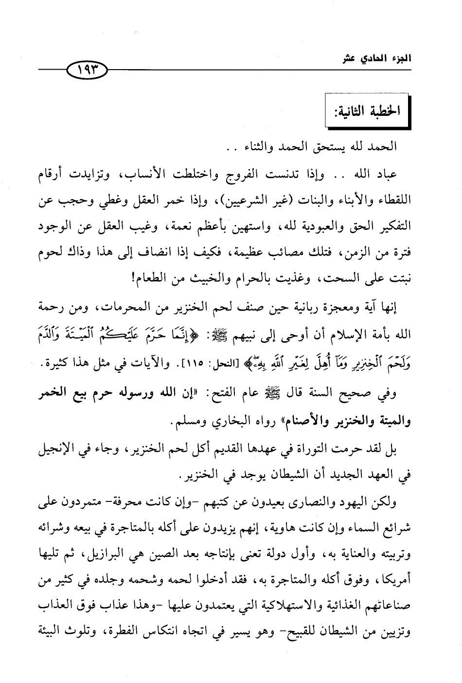 ولكن اليهود والنصارى بعيدون عن كتبهم - وإن كانت محرمة - متمردون على شرائع السماء وإن كانت هاوية، إنهم يزيدون على أكله بالمتاجرة في بيعه وشرائه وتربيته والعناية به، وأول دولة تعنى بإنتاجه بعد الصين هي البرازيل، ثم تليها أمريكا، وفوق أكله والمتاجرة به، فقد أدخلوا لحمه وشحمه وجلده في كثير من صناعاتهم الغذائية والاستهلاكية التي يعتمدون عليها - وهذا عذاب فوق العذاب وتزيين من الشيطان للقبيح - وهو يسير في اتجاه انتكاس الفطرة، وتلوث البيئة
