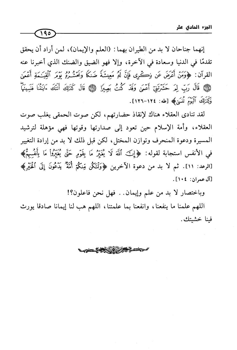 إنهما جناحان لا بد من الطيران بهما: (العلم والإيمان)، لمن أراد أن يحقق تقدمًا في الدنيا وسعادة في الآخرة، وإلا فهو الضيق والضنك الذي أخبرنا عنه القرآن: {وَمَنْ أَعْرَضَ عَن ذِكْرِي فَإِنَّ لَهُ مَعِيشَةً ضَنكًا وَنَحْشُرُهُ يَوْمَ الْقِيَامَةِ أَعْمَى (124) قَالَ رَبِّ لِمَ حَشَرْتَنِي أَعْمَى وَقَدْ كُنتُ بَصِيرًا (125) قَالَ كَذَلِكَ أَتَتْكَ آيَاتُنَا فَنَسِيتَهَا وَكَذَلِكَ الْيَوْمَ تُنسَى}.