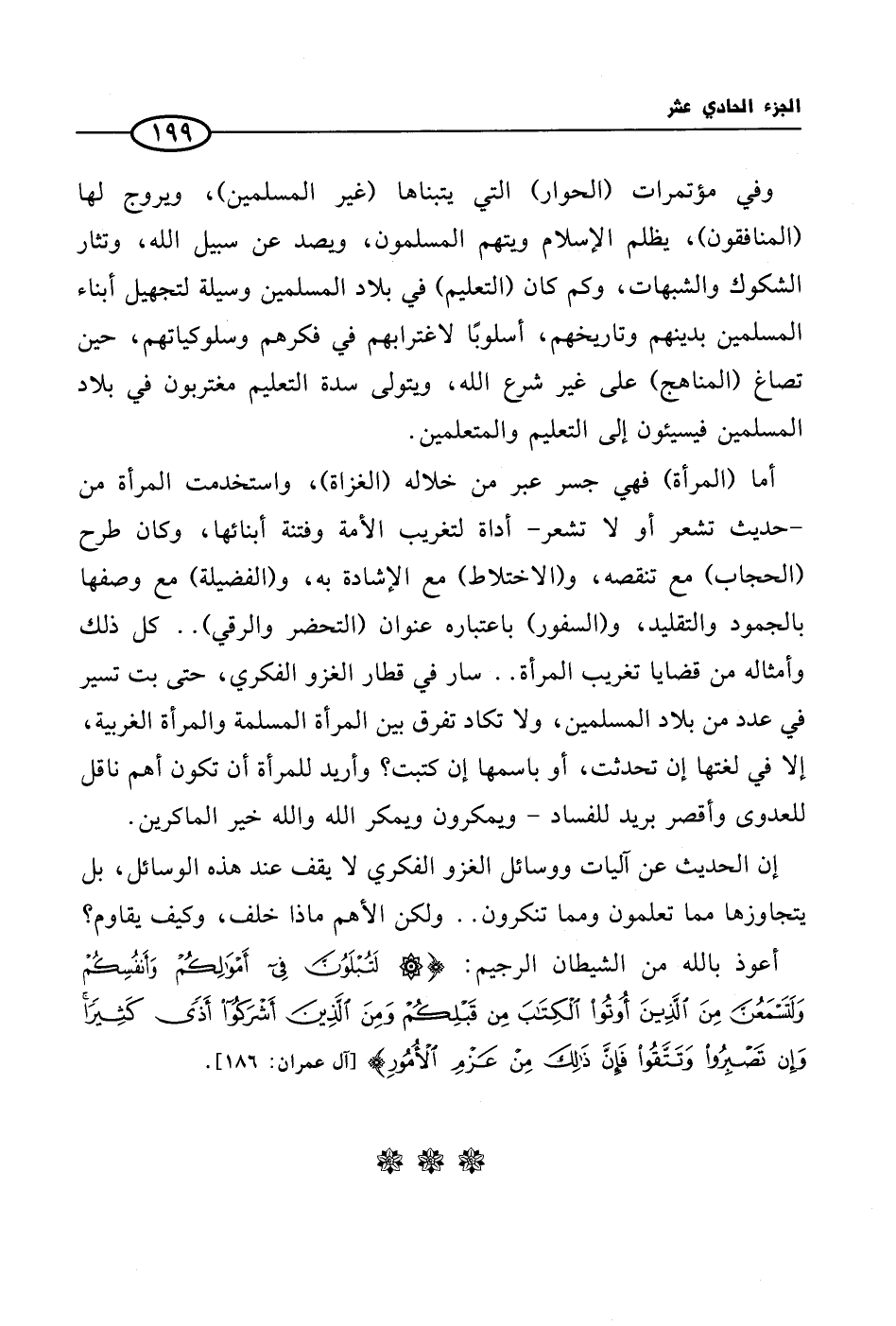 أما (المرأة) فهي جسر عبر من خلاله (الغزاة)، واستخدمت المرأة من - حديث تشعر أو لا تشعر - أداة لتغريب الأمة وفتنة أبنائها، وكان طرح (الحجاب) مع تنقصه، و (الاختلاط) مع الإشادة به، و (الفضيلة) مع وصفها بالجمود والتقليد، و (السفور) باعتباره عنوان (التحضر والرقي) .. كل ذلك وأمثاله من قضايا تغريب المرأة .. سار في قطار الغزو الفكري، حتى بت تسير في عدد من بلاد المسلمين، ولا تكاد تفرق بين المرأة المسلمة والمرأة الغربية، إلا في لغتها إن تحدثت، أو باسمها إن كتبت؟ وأريد للمرأة أن تكون أهم ناقل للعدوى وأقصر بريد للفساد - ويمكرون ويمكر الله والله خير الماكرين.