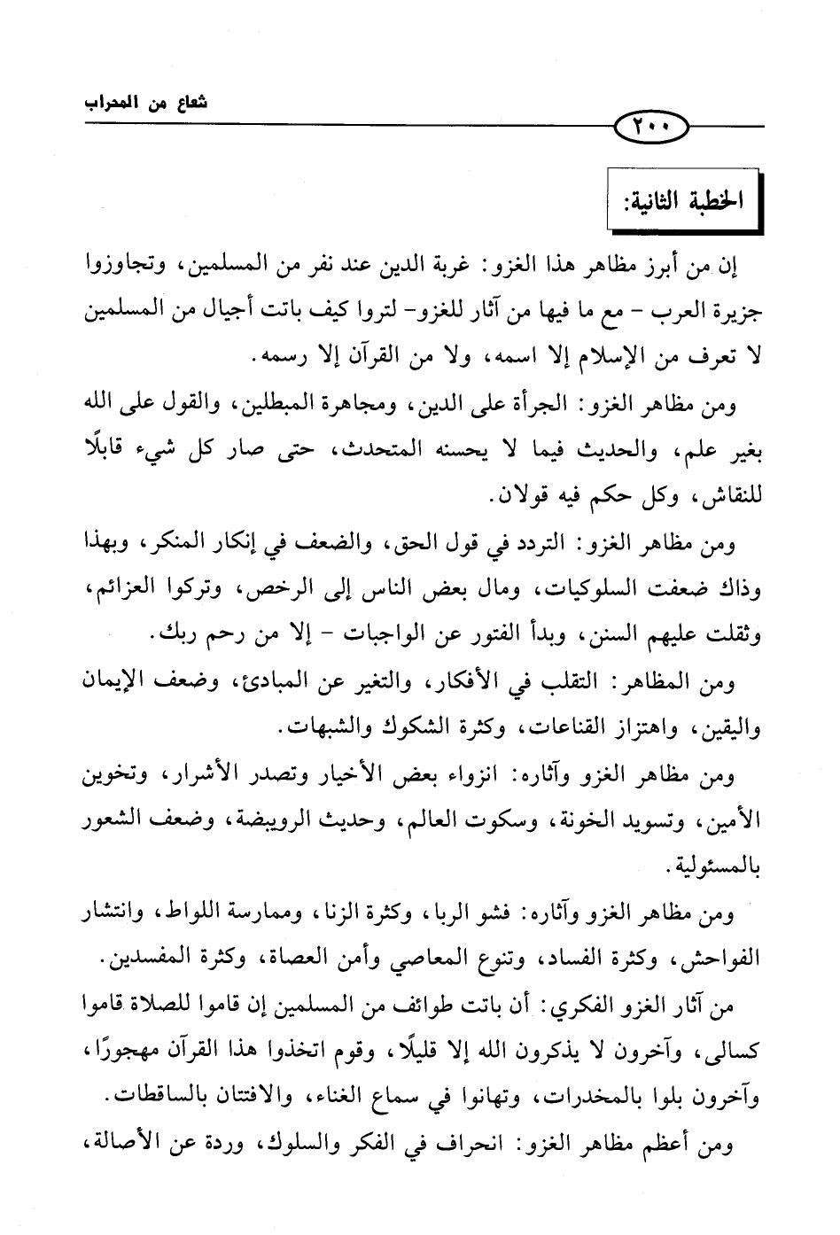 إن من أبرز مظاهر هذا الغزو: غربة الدين عند نفر من المسلمين، وتجاوزوا جزيرة العرب - مع ما فيها من آثار للغزو- لتروا كيف باتت أجيال من المسلمين لا تعرف من الإسلام إلا اسمه، ولا من القرآن إلا رسمه.