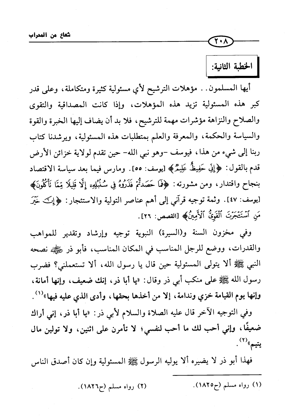 أيها المسلمون .. مؤهلات الترشيح لأي مسئولية كثيرة ومتكاملة، وعلى قدر كبر هذه المسئولية تزيد هذه المؤهلات، وإذا كانت المصداقية والتقوى والصلاح والنزاهة مؤشرات مهمة للترشيح، فلا بد أن يضاف إليها الخبرة والقوة والسياسة والحكمة، والمعرفة والعلم بمتطلبات هذه المسئولية، ويرشدنا كتاب ربنا إلى شيء من هذا، فيوسف -وهو نبي الله- حين تقدم لولاية خزائن الأرض قدم بالقول: {إني حفيظ عليم}. ومارس فيما بعد سياسة الاقتصاد بنجاح واقتدار، ومن مشورته: {فَمَا حَصَدتُّمْ فَذَرُوهُ فِي سُنبُلِهِ إِلاَّ قَلِيلاً مِّمَّا تَأْكُلُونَ}. وثمة توجيه قرآني إلى أهم عناصر التولية والاستئجار: {إن خير من استأجرت القوي الأمين}.