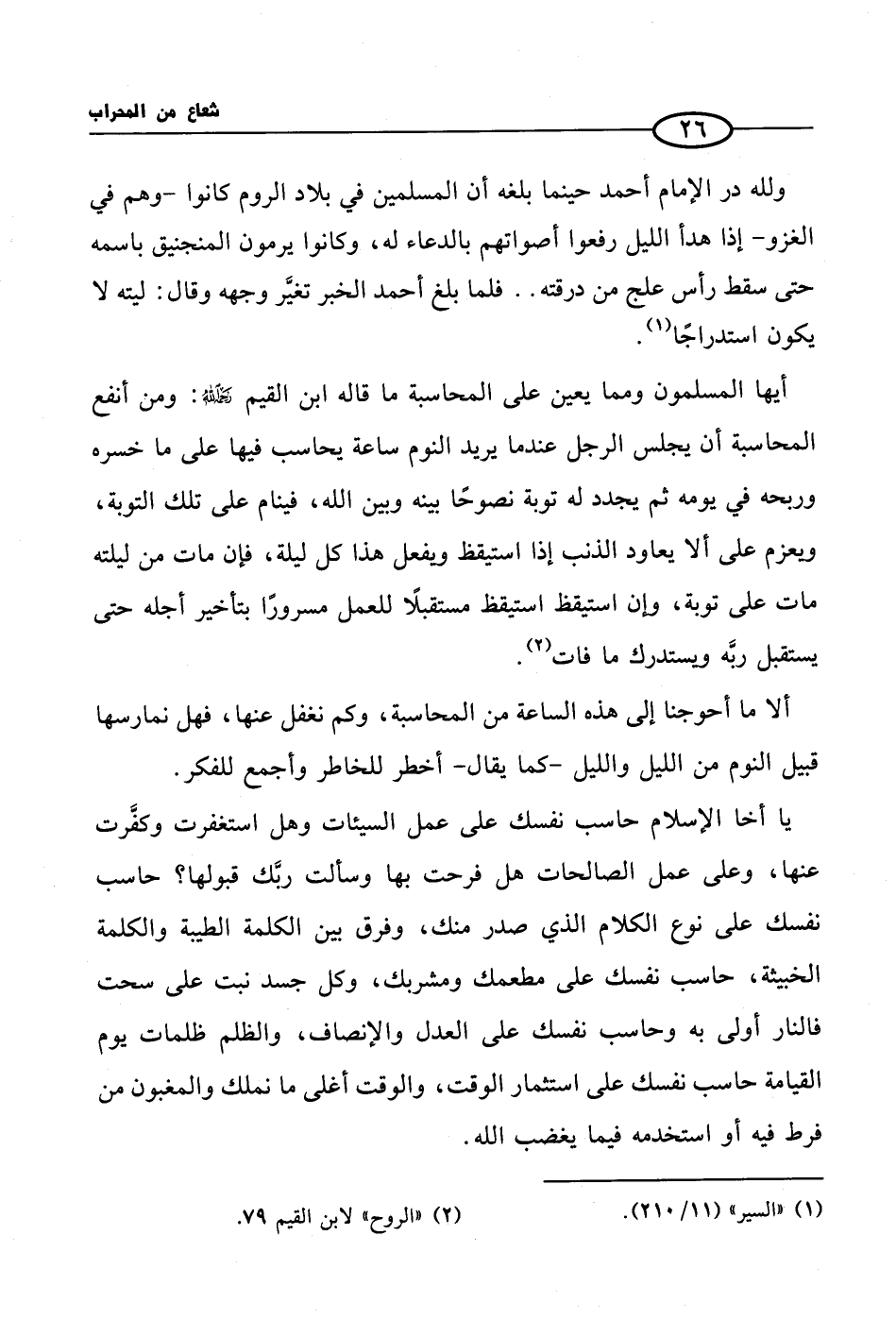 أيها المسلمون ومما يعين على المحاسبة ما قاله ابن القيم رحمه الله: ومن أنفع المحاسبة أن يجلس الرجل عندما يريد النوم ساعة يحاسب فيها على ما خسره وربحه في يومه ثم يجدد له توبة نصوحًا بينه وبين الله، فينام على تلك التوبة، ويعزم على ألا يعاود الذنب إذا استيقظ ويفعل هذا كل ليلة، فإن مات من ليلته مات على توبة، وإن استيقظ استيقظ مستقبلًا للعمل مسرورًا بتأخير أجله حتى يستقبل ربَّه ويستدرك ما فات (¬2).