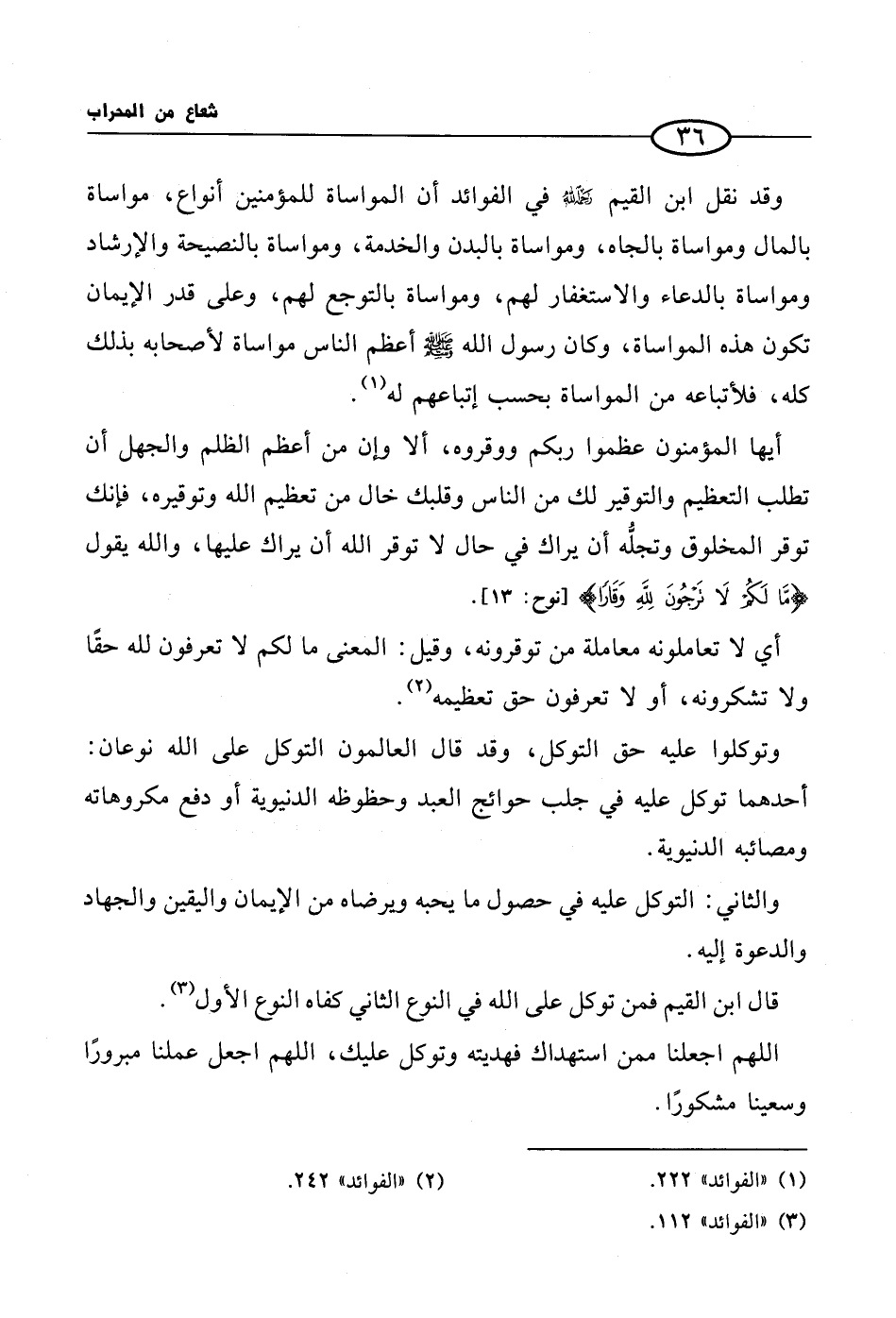 وقد نقل ابن القيم رحمه الله في الفوائد أن المواساة للمؤمنين أنواع، مواساة بالمال ومواساة بالجاه، ومواساة بالبدن والخدمة، ومواساة بالنصيحة والإرشاد ومواساة بالدعاء والاستغفار لهم، ومواساة بالتوجع لهم، وعلى قدر الإيمان تكون هذه المواساة، وكان رسول الله صلى الله عليه وسلم أعظم الناس مواساة لأصحابه بذلك كله، فلأتباعه من المواساة بحسب إتباعهم له (¬1).