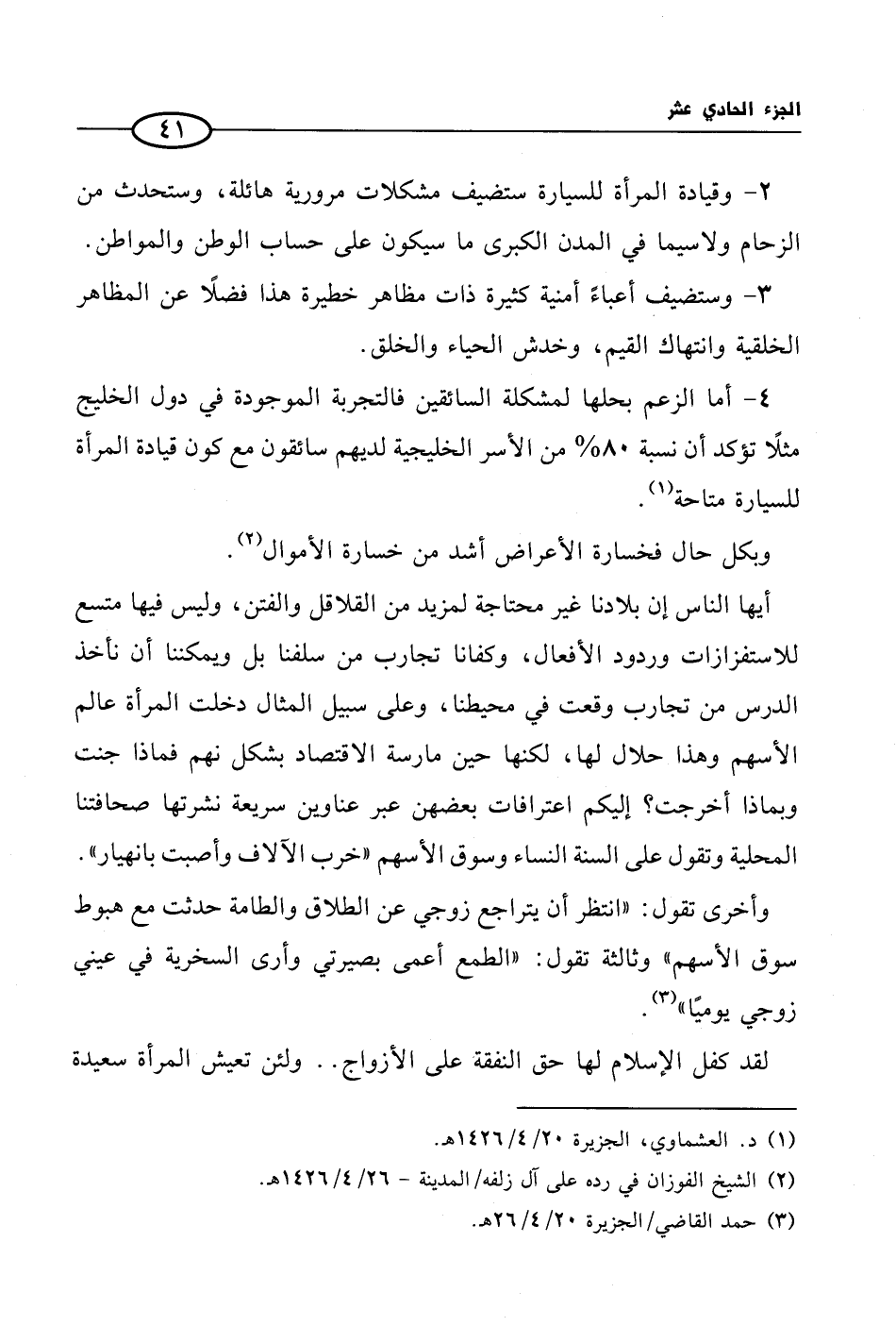 4 - أما الزعم بحلها لمشكلة السائقين فالتجربة الموجودة في دول الخليج مثلًا تؤكد أن نسبة 80% من الأسر الخليجية لديهم سائقون مع كون قيادة المرأة للسيارة متاحة (¬1).