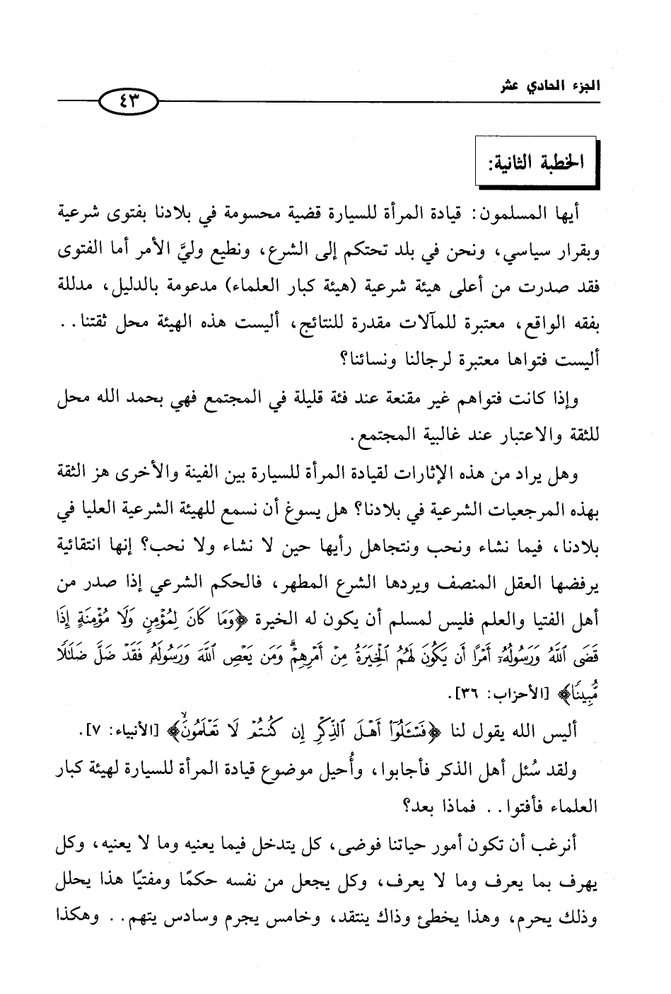 أيها المسلمون: قيادة المرأة للسيارة قضية محسومة في بلادنا بفتوى شرعية وبقرار سياسي، ونحن في بلد تحتكم إلى الشرع، ونطيع وليَّ الأمر أما الفتوى فقد صدرت من أعلى هيئة شرعية (هيئة كبار العلماء) مدعومة بالدليل، مدللة بفقه الواقع، معتبرة للمآلات مقدرة للنتائج، أليست هذه الهيئة محل ثقتنا .. أليست فتواها معتبرة لرجالنا ونسائنا؟