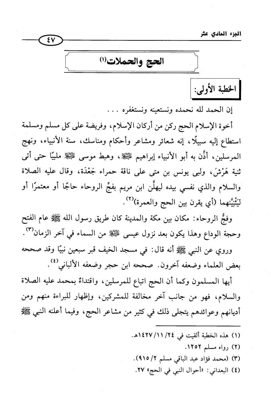 أخوة الإسلام الحج ركن من أركان الإسلام، وفريضة على كل مسلم ومسلمة استطاع إليه سبيلاً، إنه شعائر ومشاعر وأحكام ومناسك، سنة الأنبياء، ونهج المرسلين، أذَّن به أبو الأنبياء إبراهيم عليه السلام، وهبط موسى عليه السلام ملبيًا حتى أتى ثنية هَرْشَ، ولبى يونس بن متى على ناقة حمراء جَعْدَة، وقال عليه الصلاة والسلام والذي نفسي بيده ليهلَّن ابن مريم بفجِّ الروحاء حاجًا أو معتمرًا أو ليَثْنِيَّنهما (أي يقرن بين الحج والعمرة) (¬2).