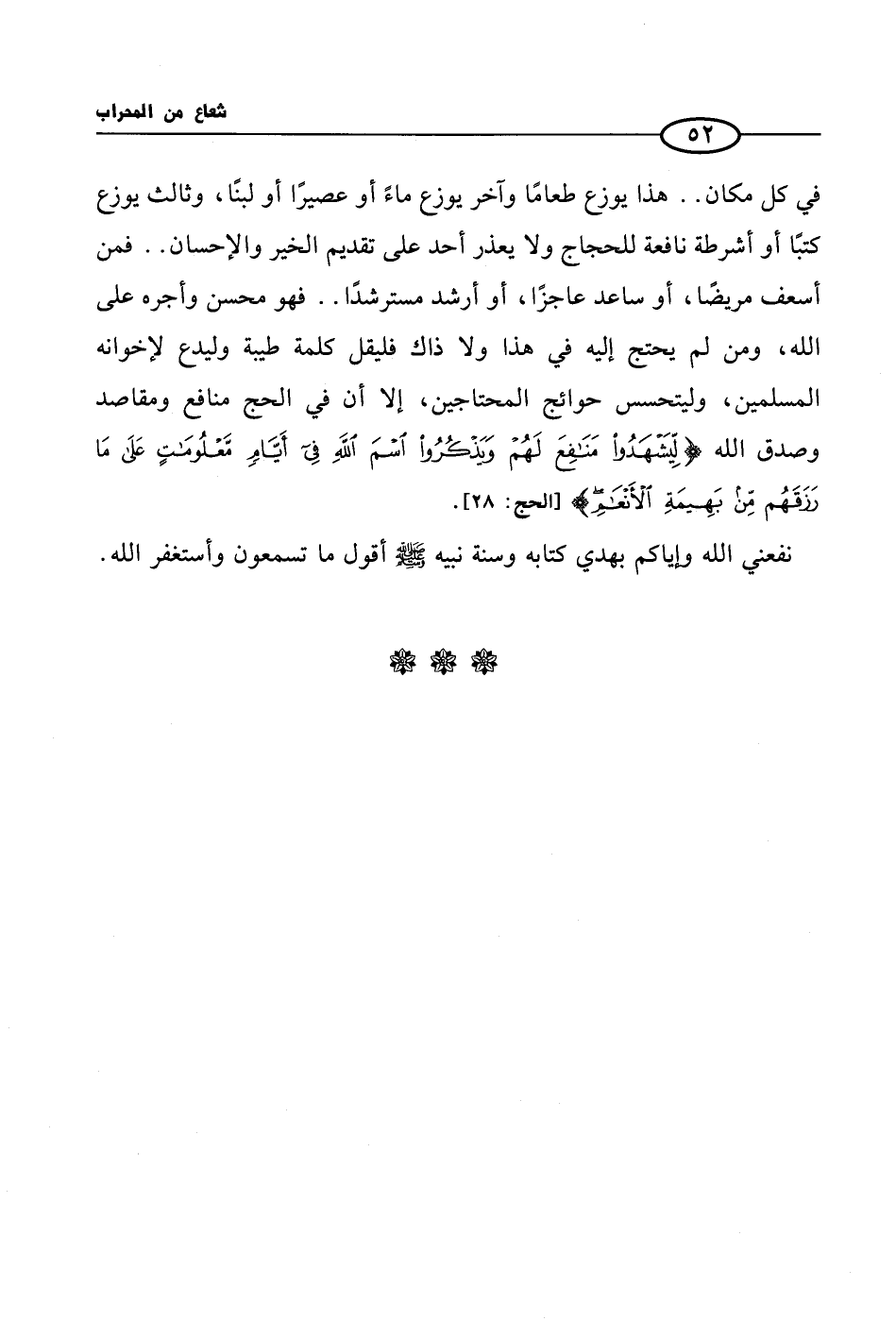في كل مكان .. هذا يوزع طعامًا وآخر يوزع ماءً أو عصيرًا أو لبنًا، وثالث يوزع كتبًا أو أشرطة نافعة للحجاج ولا يعذر أحد على تقديم الخير والإحسان .. فمن أسعف مريضًا، أو ساعد عاجزًا، أو أرشد مسترشد .. فهو محسن وأجره على الله، ومن لم يحتج إليه في هذا ولا ذاك فليقل كلمة طيبة وليدع لإخوانه المسلمين، وليتحسس حوائج المحتاجين، إلا أن في الحج منافع ومقاصد وصدق الله {ليشهدوا منافع لهم ويذكروا اسم الله في أيام معلومات على ما رزقهم من بهيمة الأنعام}.