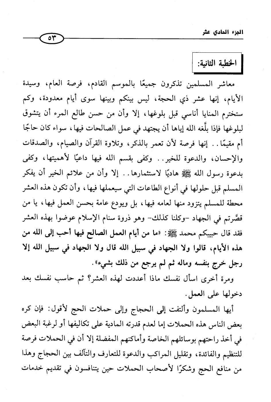 معاشر المسلمين تذكرون جميعًا بالموسم القادم، فرصة العام، وسيدة الأيام، إنها عشر ذي الحجة، ليس بينكم وبينها سوى أيام معدودة، وكم ستخترم المنا أناسي قبل بلوغها، إلا وأن من حسن طالع المرء أن يتشوق لبلوغها فإذا بلغه الله إياها أن يجتهد في عمل الصالحات فيها، سواء كان حاجًا أم مقيمًا .. إنها فرصة لأن تعمر بالذكر، وتلاوة القرآن والصيام، والصدقات والإحسان، والدعوة للخير .. وكفى بقسم الله فيها داعيًا لأهميتها، وكفى بدعوة رسول الله صلى الله عليه وسلم هاديًا لاستثمارها .. إلا وأن من علائم الخير أن يفكر المسلم قبل حلولها في أنواع الطاعات التي سيعملها فيها، وأن تكون هذه العشر محطة للمسلم يتزود منها لعامه فيها، بل ويودع عامة بحسن العمل فيها يا من قصرتم في الجهاد - وكلنا كذلك - وهو ذروة سنام الإسلام عوضوا بهذه العشر فقد قال حبيبكم محمد صلى الله عليه وسلم: «ما من أيام العمل الصالح فيها أحب إلى الله من هذه الأيام، قالوا ولا الجهاد في سبيل الله قال ولا الجهاد في سبيل الله إلا رجل خرج بنفسه وماله ثم لم يرجع من ذلك بشيء».