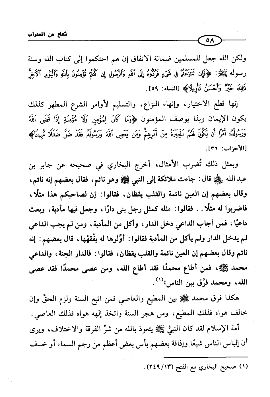 هكذا فرق محمد صلى الله عليه وسلم بين المطيع والعاصي فمن اتبع السنة ولزم الحقَّ وإن خالف هواه فذلك المطيع، ومن هجر السنة واتخذ إلهه هواه فذلك العاصي.