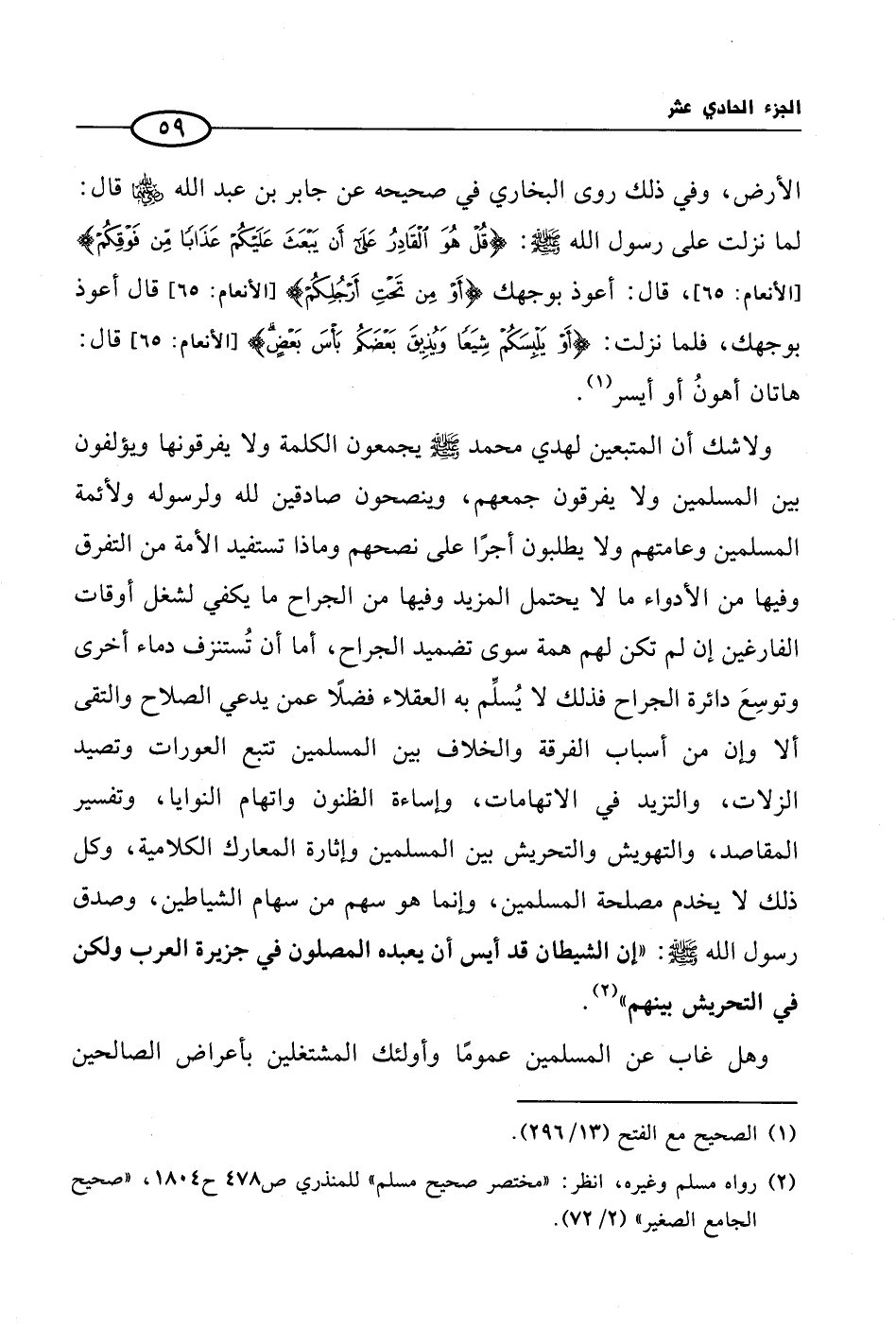 ولاشك أن المتبعين لهدي محمد صلى الله عليه وسلم يجمعون الكلمة ولا يفرقونها ويؤلفون بين المسلمين ولا يفرقون جمعهم، وينصحون صادقين لله ولرسوله ولأئمة المسلمين وعامتهم ولا يطلبون أجرًا على نصحهم وماذا تستفيد الأمة من التفرق وفيها من الأدواء ما لا يحتمل المزيد وفيها من الجراح ما يكفي لشغل أوقات الفارغين إن لم تكن لهم همة سوى تضميد الجراح، أما أن تُستنزف دماء أخرى وتوسِعَ دائرة الجراح فذلك لا يُسلِّم به العقلاء فضلًا عمن يدعي الصلاح والتقى ألا وإن من أسباب الفرقة والخلاف بين المسلمين تتبع العورات وتصيد الزلات، والتزيد في الاتهامات، وإساءة الظنون واتهام النوايا، وتفسير المقاصد، والتهويش والتحريش بين المسلمين وإثارة المعارك الكلامية، وكل ذلك لا يخدم مصلحة المسلمين، وإنما هو سهم من سهام الشياطين، وصدق رسول الله صلى الله عليه وسلم: «إن الشيطان قد أيس أن يعبده المصلون في جزيرة العرب ولكن في التحريش بينهم» (¬2).