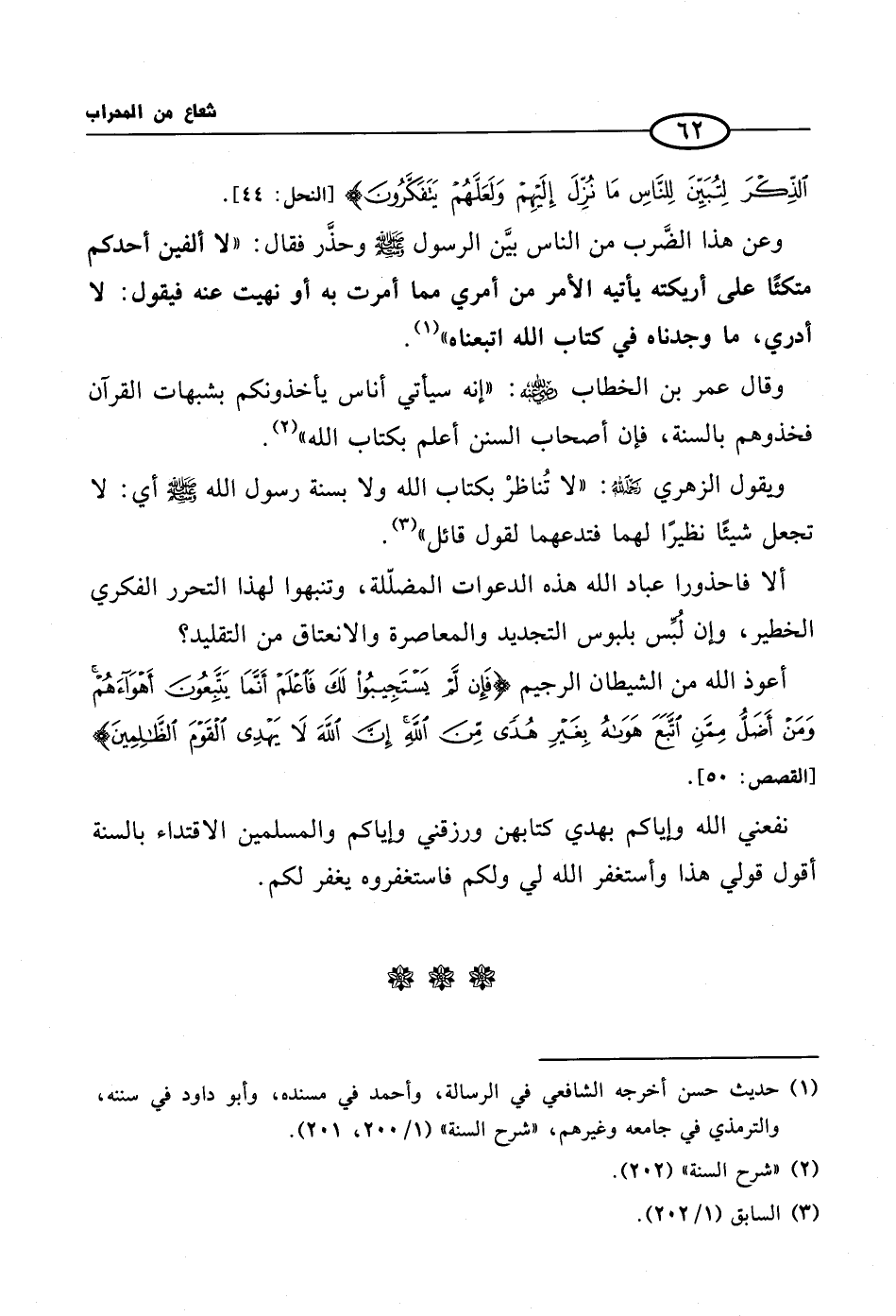 (¬1) حديث حسن أخرجه الشافعي في الرسالة، وأحمد في مسنده، وأبو داود في سننه، والترمذي في جامعه وغيرهم. (شرح السنة 1/ 200، 201).