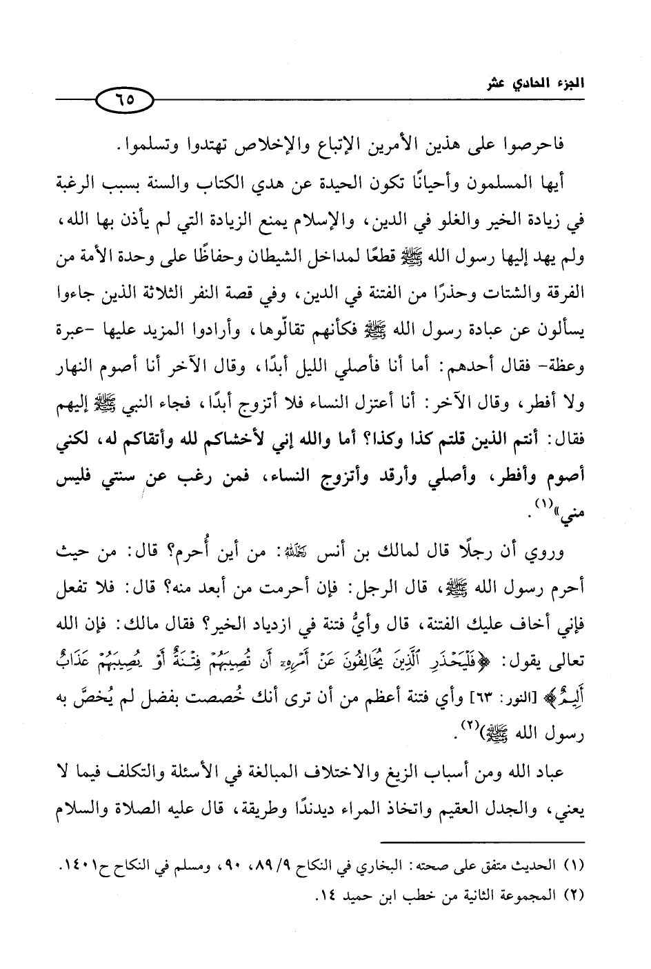 أيها المسلمون وأحيانًا تكون الحيدة عن هدي الكتاب والسنة بسبب الرغبة في زيادة الخير والغلو في الدين، والإسلام يمنع الزيادة التي لم يأذن بها الله، ولم يهد إليها رسول الله صلى الله عليه وسلم قطعًا لمداخل الشيطان وحفاظًا على وحدة الأمة من الفرقة والشتات وحذرًا من الفتنة في الدين، وفي قصة النفر الثلاثة الذين جاءوا يسألون عن عبادة رسول الله صلى الله عليه وسلم فكأنهم تقالّوها، وأرادوا المزيد عليها - عبرة وعظة - فقال أحدهم: أما أنا فأصلي الليل أبدًا، وقال الآخر أنا أصوم النهار ولا أفطر، وقال الآخر: أنا أعتزل النساء فلا أتزوج أبدًا، فجاء النبي صلى الله عليه وسلم إليهم فقال: أنتم الذين قلتم كذا وكذا؟ أما والله إني لأخشاكم لله وأتقاكم له، لكني أصوم وأفطر، وأصلي وأرقد وأتزوج النساء، فمن رغب عن سنتي فليس مني» (¬1).