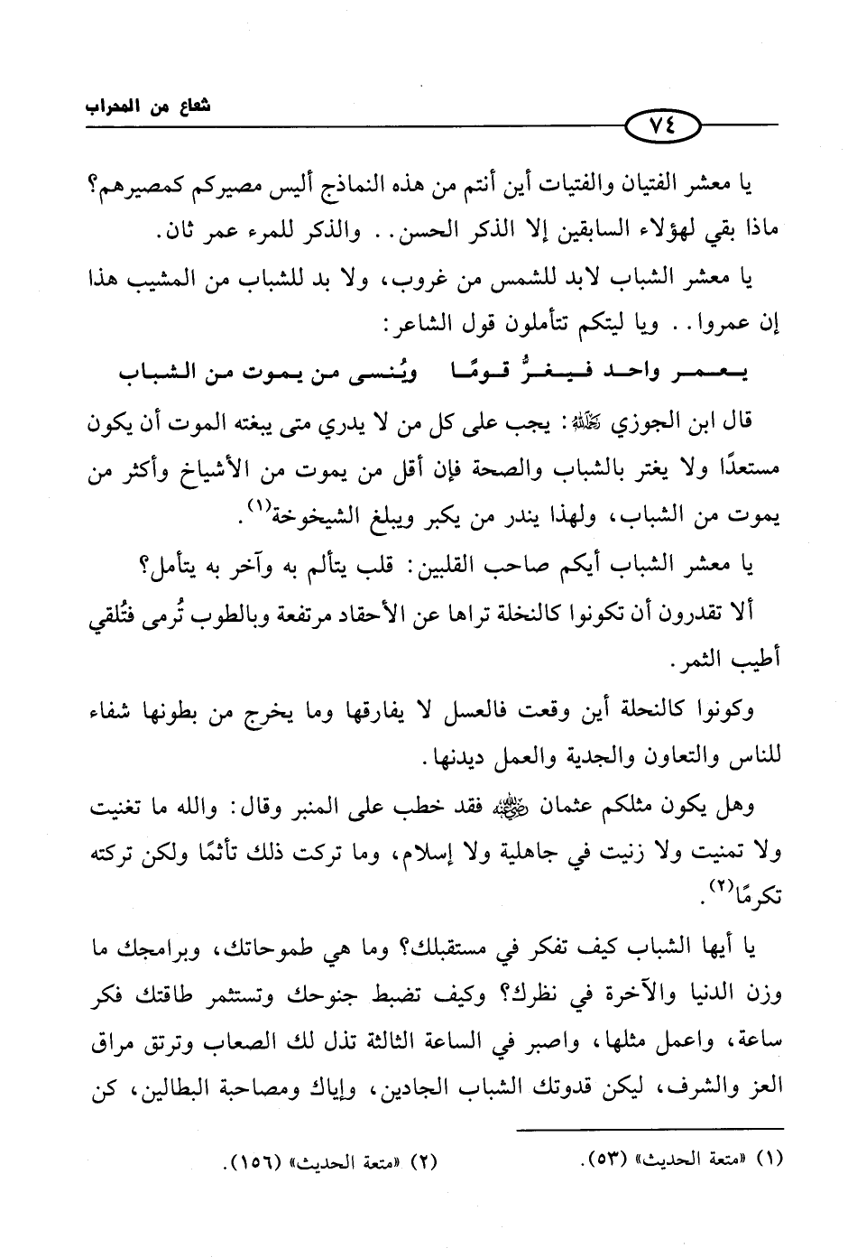 يا أيها الشباب كيف تفكر في مستقبلك؟ وما هي طموحاتك، وبرامجك ما وزن الدنيا والآخرة في نظرك؟ وكيف تضبط جنوحك وتستثمر طاقتك فكر ساعة، واعمل مثلها، واصبر في الساعة الثالثة تذل لك الصعاب وترتق مراق العز والشرف، ليكن قدوتك الشباب الجادين، وإياك ومصاحبة البطالين، كن