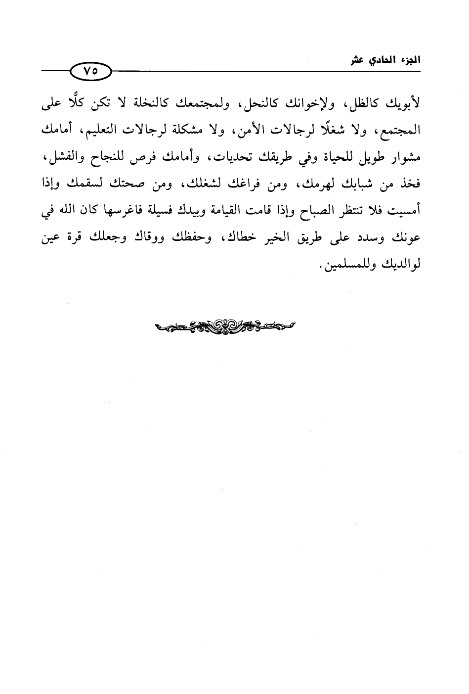 لأبويك كالظل، ولإخوانك كالنحل، ولمجتمعك كالنخلة لا تكن كلًّا على المجتمع، ولا شغلًا لرجالات الأمن، ولا مشكلة لرجالات التعليم، أمامك مشوار طويل للحياة وفي طريقك تحديات، وأمامك فرص للنجاح والفشل، فخذ من شبابك لهرمك، ومن فراغك لشغلك، ومن صحتك لسقمك وإذا أمسيت فلا تنتظر الصباح وإذا قامت القيامة وبيدك فسيلة فاغرسها كان الله في عونك وسدد على طريق الخير خطاك، وحفظك ووقاك وجعلك قرة عين لوالديك وللمسلمين.