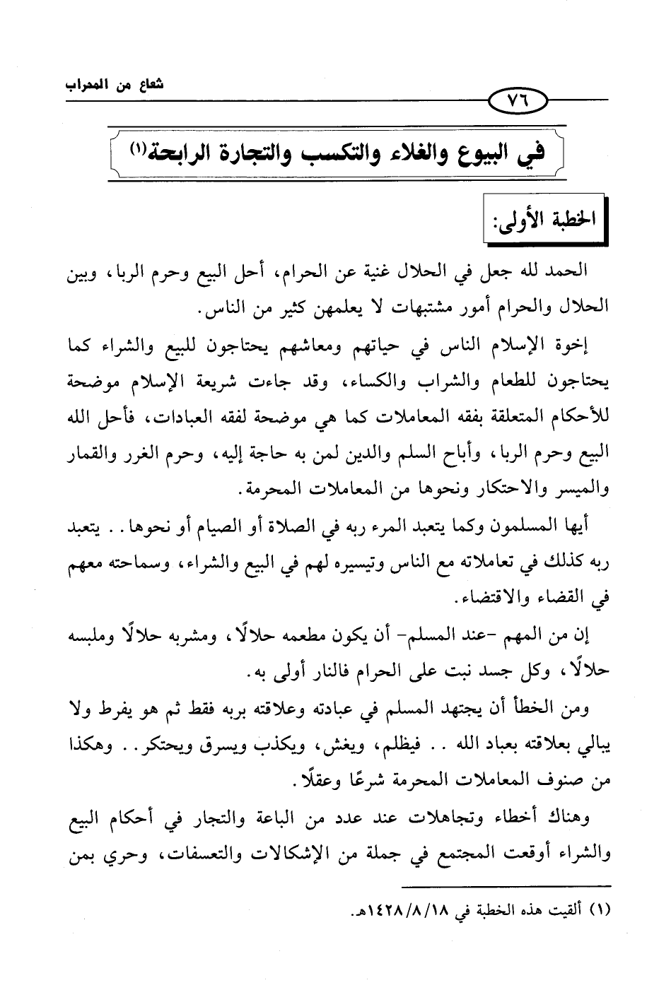 إخوة الإسلام الناس في حياتهم ومعاشهم يحتاجون للبيع والشراء كما يحتاجون للطعام والشراب والكساء، وقد جاءت شريعة الإسلام موضحة للأحكام المتعلقة بفقه المعاملات كما هي موضحة لفقه العبادات، فأحل الله البيع وحرم الربا، وأباح السلم والدين لمن به حاجة إليه، وحرم الغرر والقمار والميسر والاحتكار ونحوها من المعاملات المحرمة.