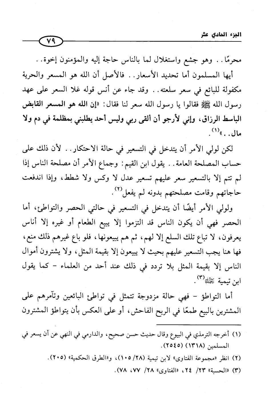 ولولي الأمر أيضًا أن يتدخل في التسعير في حالتي الحصر والتواطئ، أما الحصر فهي أن يكون الناس قد التزموا إلا بيع الطعام أو غيره إلا أناس يعرفون، لا تباع تلك السلع إلا لهم، ثم هم يبيعونها، فلو باع غيرهم ذلك منع، فها هنا يجب التسعير عليهم بحيث لا يبيعون إلا بقيمة المثل، ولا يشترون أموال الناس إلا بقيمة المثل بلا تردد في ذلك عند أحد من العلماء - كما يقول ابن تيمية رحمه الله (¬3).