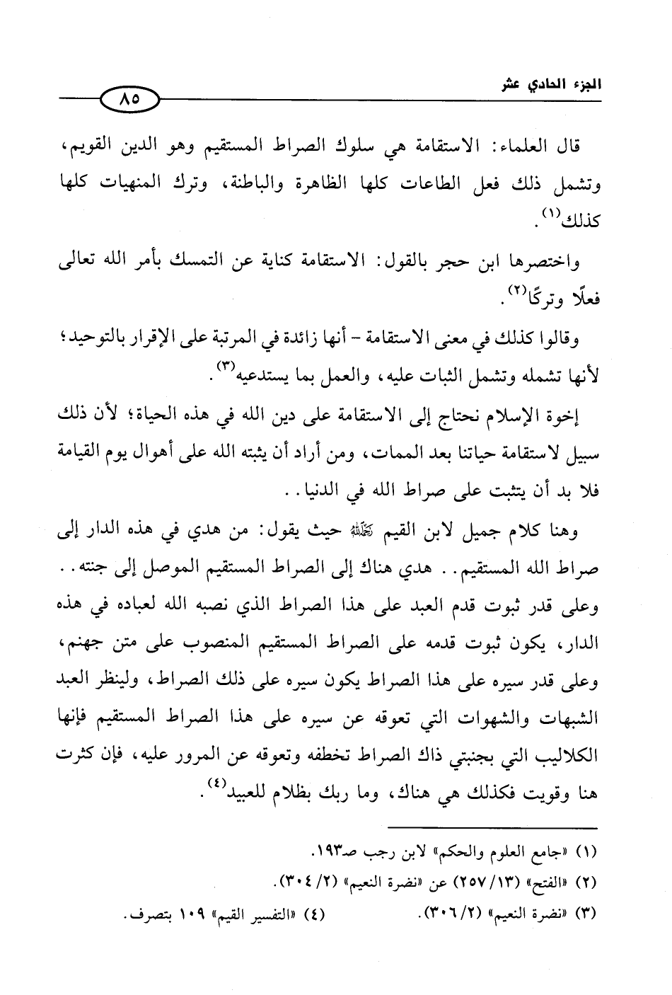 واختصرها ابن حجر بالقول: الاستقامة كناية عن التمسك بأمر الله تعالى فعلاً وتركًا (¬2).