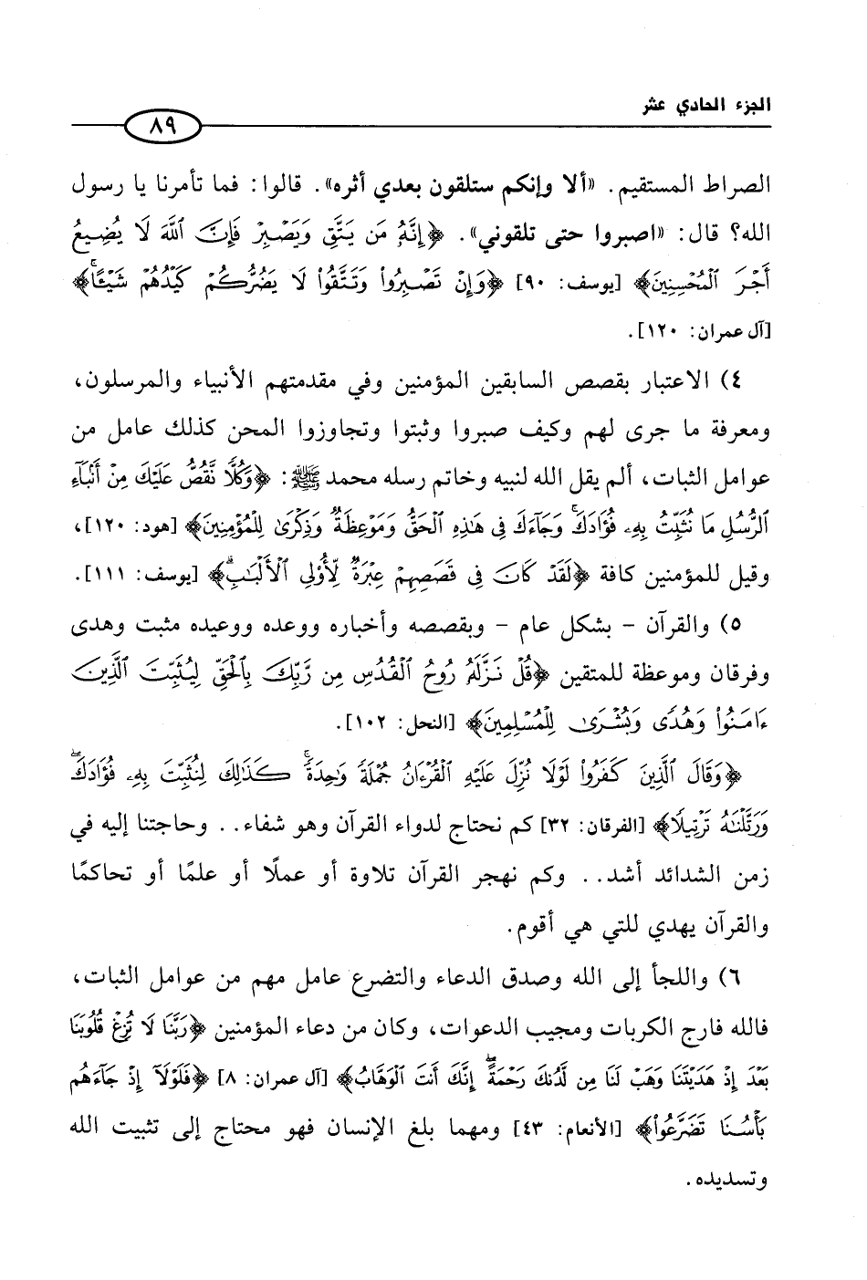 6) واللجأ إلى الله وصدق الدعاء والتضرع عامل مهم من عوامل الثبات، فالله فارج الكربات ومجيب الدعوات، وكان من دعاء المؤمنين {رَبَّنَا لاَ تُزِغْ قُلُوبَنَا بَعْدَ إِذْ هَدَيْتَنَا وَهَبْ لَنَا مِن لَّدُنكَ رَحْمَةً إِنَّكَ أَنتَ الْوَهَّابُ} {فَلَوْلا إِذْ جَاءهُمْ بَأْسُنَا تَضَرَّعُوا} ومهما بلغ الإنسان فهو محتاج إلى تثبيت الله وتسديده.