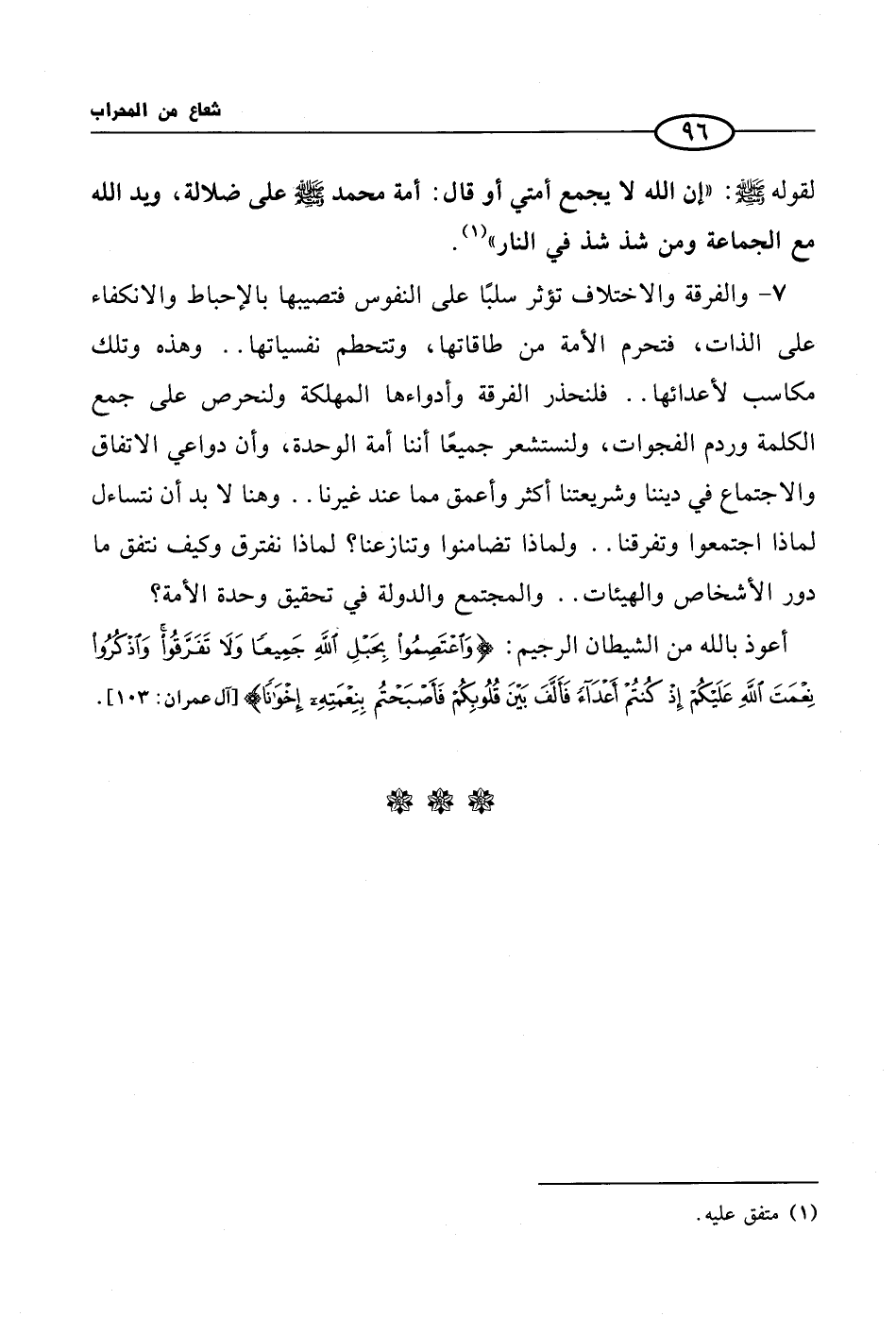 7 - والفرقة والاختلاف تؤثر سلبًا على النفوس فتصيبها بالإحباط والانكفاء على الذات، فتحرم الأمة من طاقاتها، وتتحطم نفسياتها .. وهذه وتلك مكاسب لأعدائها .. فلنحذر الفرقة وأدواءها المهلكة ولنحرص على جمع الكلمة وردم الفجوات، ولنستشعر جميعًا أننا أمة الوحدة، وأن دواعي الاتفاق والاجتماع في ديننا وشريعتنا أكثر وأعمق مما عند غيرنا .. وهنا لا بد أن نتساءل لماذا اجتمعوا وتفرقنا .. ولماذا تضامنوا وتنازعنا؟ لماذا نفترق وكيف نتفق ما دور الأشخاص والهيئات .. والمجتمع والدولة في تحقيق وحدة الأمة؟