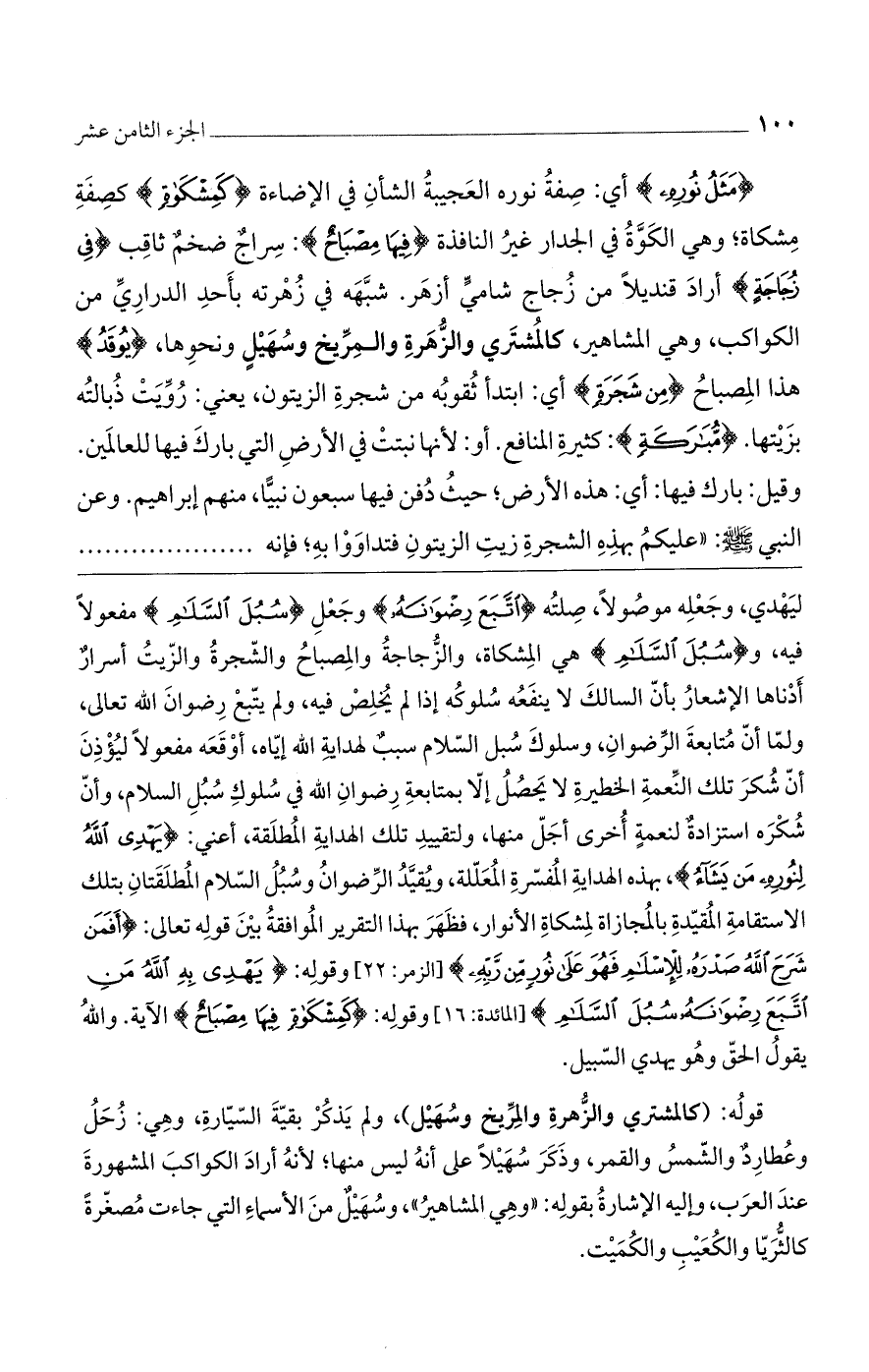 {مَثَلُ نُورِهِ} أي: صفة نوره العجيبة الشأن في الإضاءة {كَمِشْكَاةٍ} كصفة مشكاة، وهي الكوة في الجدار غير النافذة {فِيهَا مِصْبَاحٌ}: سراجٌ ضخمٌ ثاقب {فِي زُجَاجَةٍ} أراد قنديلاً من زجاج شاميٍّ أزهر. شبهه في زهرته بأحد الدراري من الكواكب، وهي المشاهير، كالمشتري والزهرة والمريخ وسهيلٍ ونحوها. {يُوقَدُ} هذا المصباح {مِنْ شَجَرَةٍ} أي: ابتداء ثقوبه من شجرة الزيتون، يعني: رويت ذبالته بزيتها. {مُبَارَكَةٍ}: كثيرة المنافع. أو: لأنها نبتت في الأرض التي بارك فيها للعالمين. وقيل: بارك فيها: أي: هذه الأرض، حيث دفن فيها سبعون نبياً، منهم إبراهيم. وعن النبي - صلى الله عليه وسلم -: "عليكم بهذه الشجرة زيت الزيتون فتداووا به، فإنه