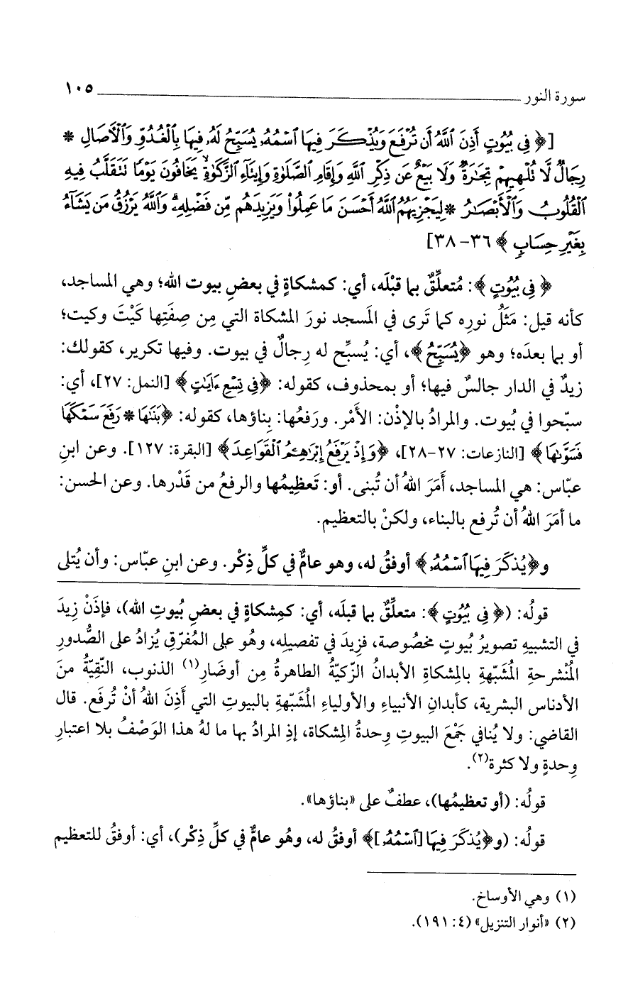 {فِي بُيُوتٍ}: متعلقٌ بما قبله، أي كمشكاةٍ في بعض بيوت الله، وهي المساجد، كأنه قيل: مثل نوره كما ترى في المسجد نور المشكاة التي من صفتها كيت وكيت، أو بما بعده، وهو {يُسَبِّحُ}، أي: يسبح له رجالٌ في بيوت. وفيها تكرير، كقولك: زيدٌ في الدار جالسٌ فيها، أو بمحذوف، كقوله: {فِي تِسْعِ آَيَاتٍ} [النمل: 27]، أي: سبحوا في بيوت. والمراد ب الإذن: الأمر. ورفعها: بناؤها، كقوله: {بَنَاهَا (27) رَفَعَ سَمْكَهَا فَسَوَّاهَا} [النازعات: 27 - 28]، {وَإِذْ يَرْفَعُ إِبْرَاهِيمُ الْقَوَاعِدَ} [البقرة: 127]. وعن ابن عباس: هي المساجد، أمر الله أن تبني. أو: تعظيمها والرفع من قدرها. وعن الحسن: ما أمر الله أن ترفع بالبناء، ولكن بالتعظيم.