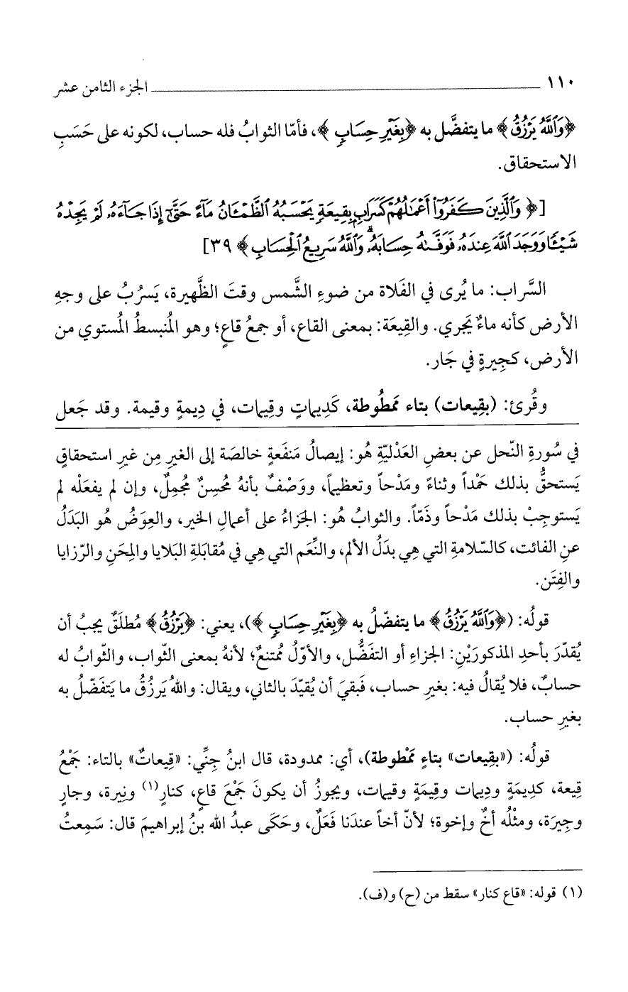 السراب: ما يرى في الفلاة من ضوء الشمس وقت الظهيرة، يسرب على وجه الأرض كأنه ماءٌ يجري. والقيعة: بمعنى القاع، أو جمع قاعٍ، وهو المنبسط المستوي من الأرض، كجيرةٍ في جار.