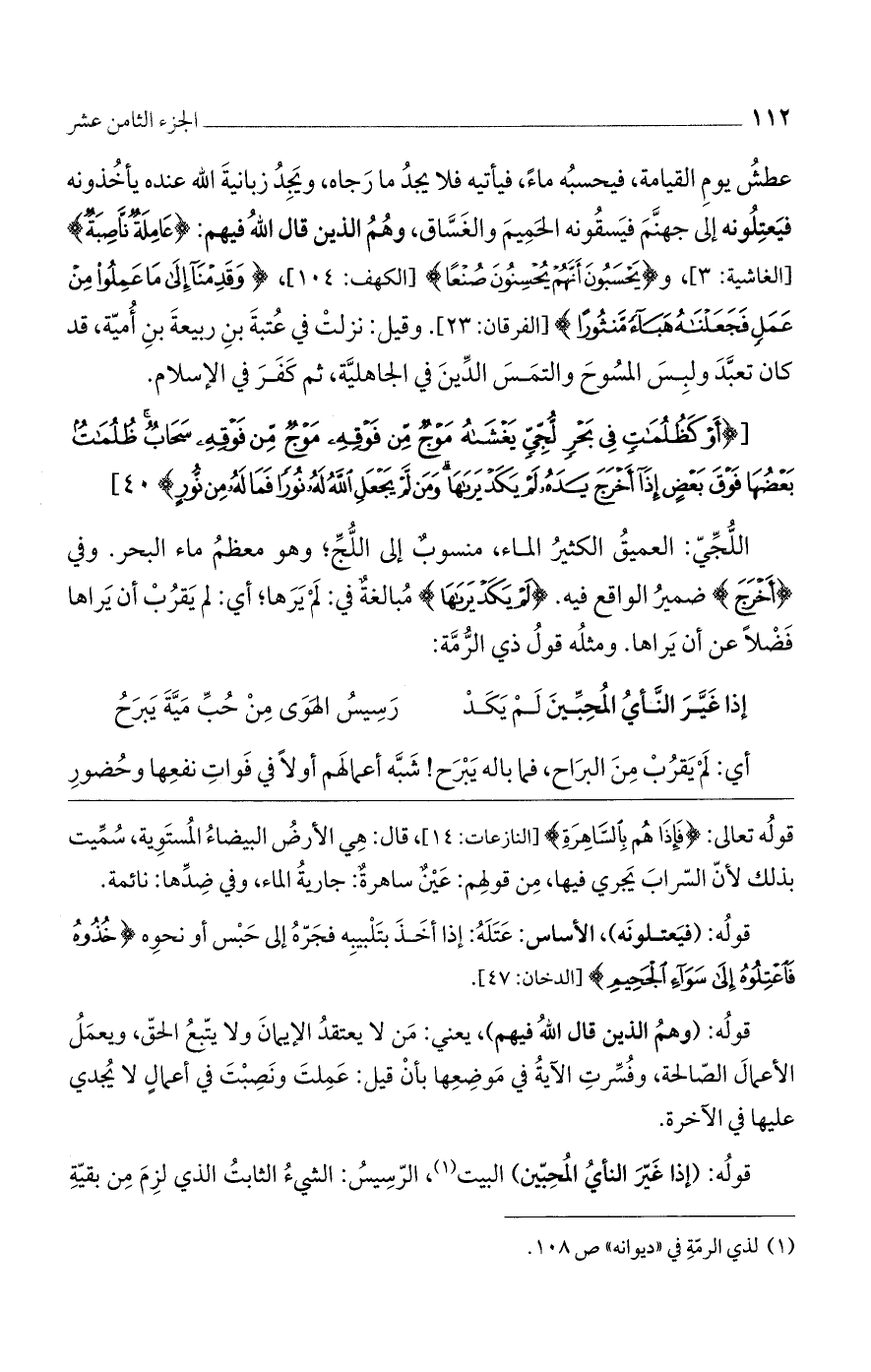 عطش يوم القيامة، فيحسبه ماءً، فيأتيه فلا يجد ما رجاه، ويجد زبانية الله عنده يأخذونه فيعتلونه إلى جهنهم فيسقونه الحميم والغساق، وهم الذين قال الله فيهم: {عَامِلَةٌ نَاصِبَةٌ} [الغاشية: 3]، و {يَحْسَبُونَ أَنَّهُمْ يُحْسِنُونَ صُنْعًا} [الكهف: 104]، {وَقَدِمْنَا إِلَى مَا عَمِلُوا مِنْ عَمَلٍ فَجَعَلْنَاهُ هَبَاءً مَنْثُورًا} [الفرقان: 23]. وقيل: نزلت في عتبة بن ربيعة بن أمية، قد كان تعبد ولبس المسوح والتمس الدين في الجاهلية، ثم كفر في الإسلام.