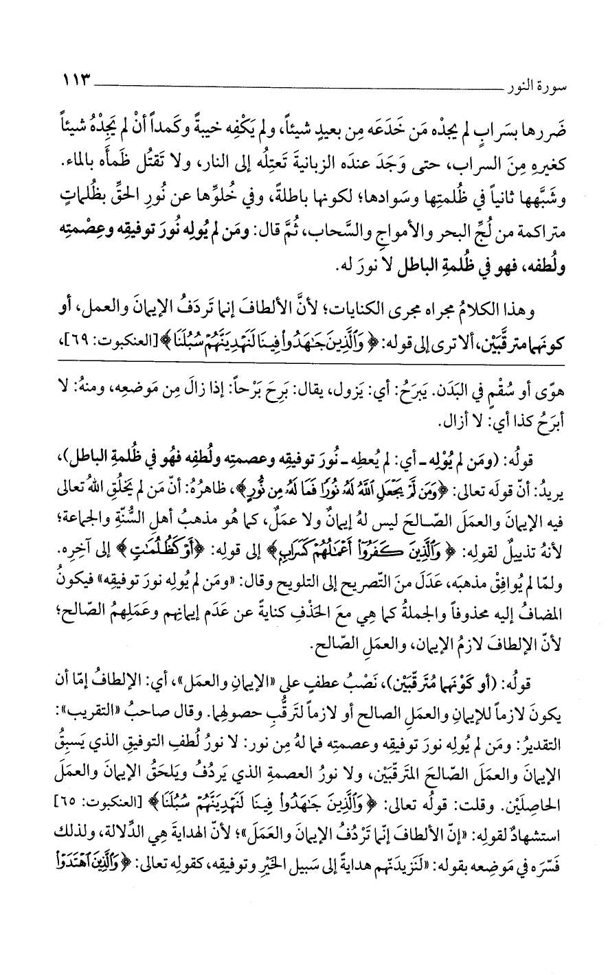 ضررها بسرابٍ لم يجده من خدعه من بعيدٍ شيئاً، ولم يكفه خيبةً وكمداً أن لم يجده شيئاً كغيره من السراب، حتى وجد عنده الزبانية تعتله إلى النار، ولا تقتل ظمأه بالماء. وشبهها ثانياً في ظلمتها وسوادها، لكونها باطلةً، وفي خلوها عن نور الحق بظلماتٍ متراكمة من لج البحر والأمواج والسحاب، ثم قال: ومن لم يوله نور توفيقه وعصمته ولطفه، فهو في ظلمة الباطل لا نور له.