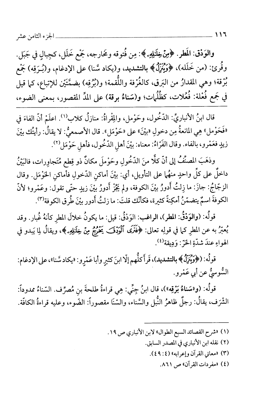 والودق: المطر. {مِنْ خِلَالِهِ}: من فتوقه ومخارجه، جمع خلل، كجبالٍ في جبل. وقرئ: (من خلله)، {وَيُنَزِّلُ} بالتشديد، و (يكاد سنا) على الإدغام، و (برقه) جمع برقة، وهي المقدار من البرق، كالغرمة واللقمة، و (برقه) بضمتين للإتباع، كما قيل في جمع فعلة، فعلات، كظلمات، (وسناء برقة) على المد المقصور، بمعنى الضوء،