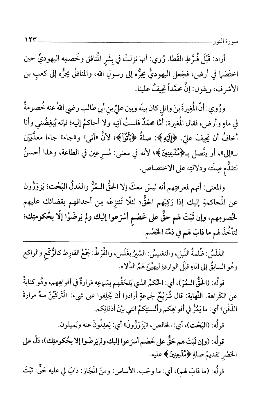 وروي: أن المغيرة بن وائلٍ كان بينه وبين علي بن أبي طالب رضي الله عنه خصومةٌ في ماءٍ وأرض، فقال المغيرة: أما محمدٌ فلست آتيه ولا أحاكم إليه، فإنه يبغضني وأن أخاف أن يحيف علي. {إِلَيْهِ}: صلة {يَاتُوا}، لأن "أتى" و"جاء" جاءا معديين بـ "إلى"، أو يتصل بـ {مُذْعِنِينَ}، لأن في معنى: مسرعين في الطاعة، وهذا أحسن لتقدم صلته ودلالته على الاختصاص.