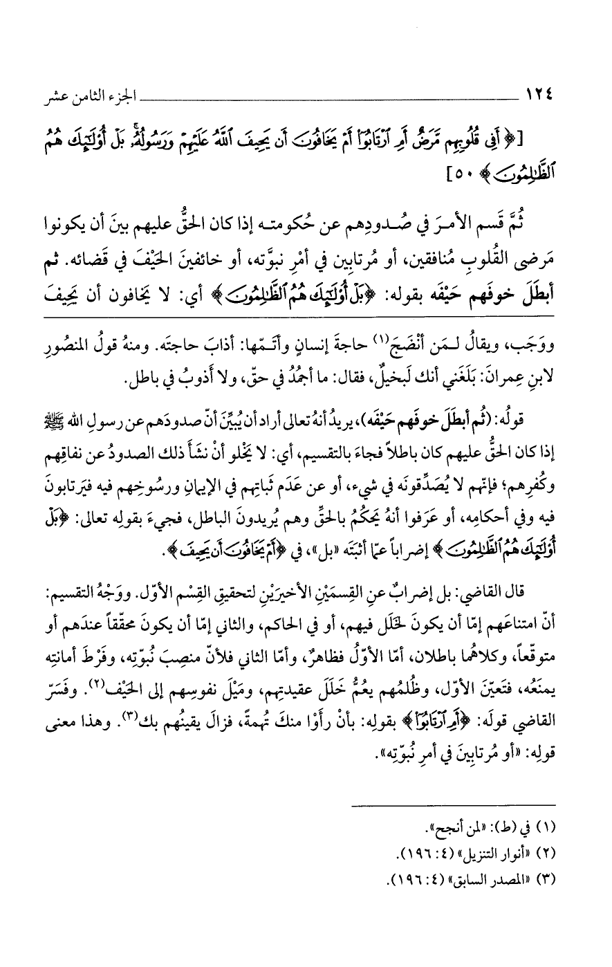 قال القاضي: بل إضرابٌ عن القسمين الأخيرين لتحقيق القسم الأول. ووجه التقسيم: أن امتناعهم إما أن يكون لخلل فيهم، أو في الحاكم، والثاني إما أن يكون محققاً عندهم أو متوقعاً، وكلاهما باطلان، أما الأول فظاهرٌ، وأما الثاني فلأن منصب نبوته، وفرط أمانته يمنعه، فتعين الأول، وظلمهم يعم خلل عقيدتهم، وميل نفوسهم إلى الحيف. وفسر القاضي قوله: {أَمِ ارْتَابُوا} بقوله: بأن رأوا منك تهمةً، فزال يقينهم بك. وهذا معنى قوله: "أو مرتابين في أمر نبوته".