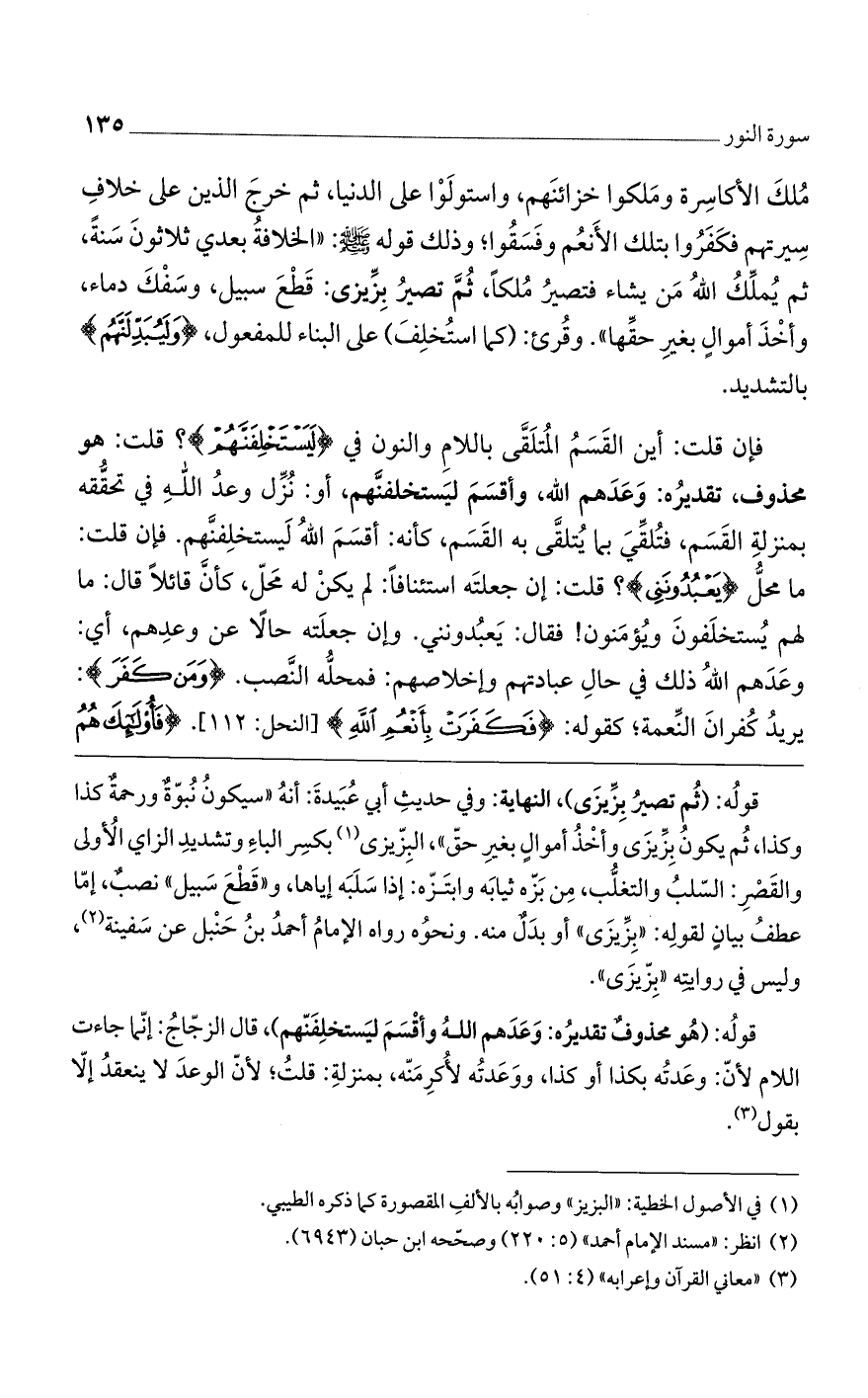 ملك الأكاسرة وملكوا خزائنهم، واستولوا على الدنيا، ثم خرج الذين على خلاف سيرتهم فكفروا بتلك الأنعم وفسقوا، وذلك قوله - صلى الله عليه وسلم -: "الخلافة بعدي ثلاثون سنةً، ثم يملك الله من يشاء الله من يشاء فتصير ملكاً، ثم تصير بزيرى: قطع سبيل، وسفك دماء، وأخذ أموالٍ بغير حقها". وقرئ: (: ما استخلف) على البناء للمفعول، {وَلَيُبَدِّلَنَّهُمْ} بالتشديد.