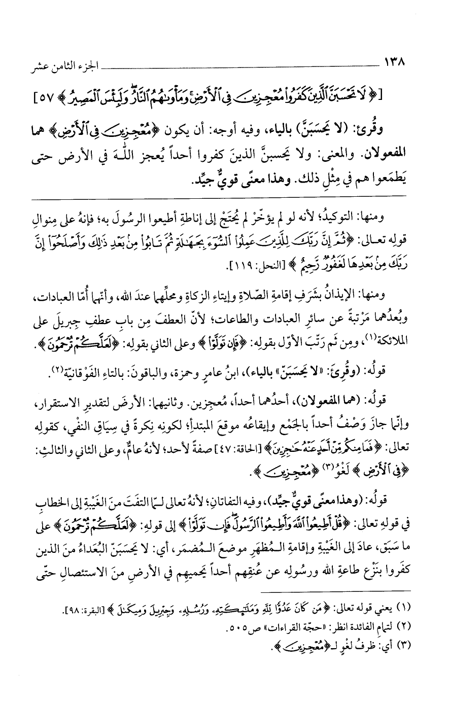 قوله: (وهذا معنى قويٌ جيد)، وفيه التفاتان، لأنه تعالى لما التفت من الغيبة إلى الخطاب في قوله تعالى: {قُلْ أَطِيعُوا اللَّهَ وَأَطِيعُوا الرَّسُولَ فَإِنْ تَوَلَّوْا} إلى قوله: {لَعَلَّكُمْ تُرْحَمُونَ} على ما سبق، عاد إلى الغيبة وإقامة المظهر موضع المضمر، أي: لا يحسبن البعداء من الذين كفروا بنزع طاعة الله ورسوله عن عنقهم أحداً يحميهم في الأرض من الاستئصال حتى