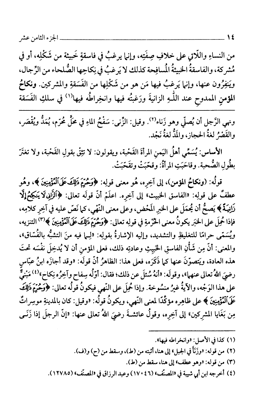 وقوله: (ونكاح المؤمن)، إلى آخره، هو معنى قوله: {وَحُرِّمَ ذَلِكَ عَلَى الْمُؤْمِنِينَ}، وهو عطفٌ على قوله: "الفاسق الخبيث" إلى آخره. اعلم أن قوله تعالى: {الزَّانِي لَا يَنْكِحُ إلَّا زَانِيَةً} يصح أن يحمل على الخبر المحض، وعلى معنى النهي، كما نص عليه في آخر كلامه، فإذا حمل على الخبر يكون معنى الحرمة في قوله تعالى: {وَحُرِّمَ ذَلِكَ عَلَى الْمُؤْمِنِينَ} التنزيه، ويسمى حرامًا للتغليظ والتشديد، وإليه الإشارة بقوله: "لما فيه من التشبه بالفساق"، والمعنى: أن من شأن الفاسق الخبيث وعادته ذلك، فعلى المؤمن أن لا يدخل نفسه تحت هذه العادة، ويتصون عنها كما ذكره، فعلى هذا: الظاهر أن قوله: "وقد أجازه ابن عباس رضي الله عنهما"، وقوله: "أنه سئل عن ذلك، فقال: أوله سفاح وآخره نكاح" مبني على هذا الوجه، والآية غير منسوخة. وإذا حمل على النهي فيكون قوله تعالى: {وَحُرِّمَ ذَلِكَ عَلَى الْمُؤْمِنِينَ} على ظاهره مؤكدًا لمعنى النهي، ويكون قوله: "وقيل: كان بالمدينة موسراتٌ من بغايا المشركين" إلى آخره، وقول عائشة رضي الله تعالى عنها: "إن الرجل إذا زنى