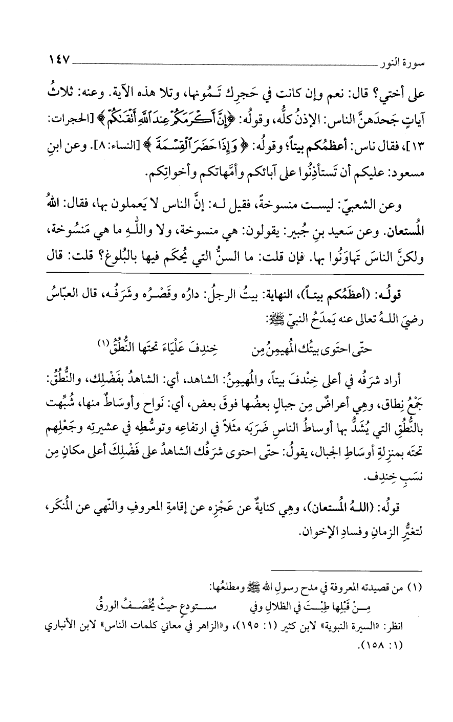 أراد شرفه في أعلى خندق بيتاً، والمهيمن: الشاهد، أي: الشاهد بفضلك، والنطق: جمع نطاق، وهي أعراضٌ من جبالٍ بعضها فوق بعض، أي: نواح وأوساطٌ منها، شبهت بالنطق التي يشد بها أوساط الناس ضربه مثلاً في ارتفاعه وتوسطه في عشيرته وجعلهم تحته بمنزلة أوساط الجبال، يقول: حتى احتوى شرفك الشاهد على فضلك أعلى مكانٍ من نسب خندق.